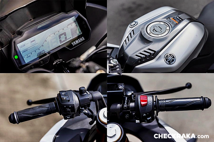 ไฟหน้า Full LED ช่องดักลมตรงกลางและดีไซน์สปอร์ต DNA จาก Yamaha YFZ-R1 ถังน้ำมันตกแต่งด้วยช่องอากาศ ชิวหน้าทรงลู่ลม เวลาหมอบสามารถมองทะลุได้ ไฟท้าย LED ไฟเลี้ยวแบบธรรมดา พร้อมสวิตช์ไฟฉุกเฉิน ส่วนเบาะนั่งคนขับเว้าลึกมีขนาดเล็กการนั่งจะเทมาด้านหน้าส่วนเบาะคนซ้อนยกสูงสไตล์บิ๊กไบค์ การขึ้นซ้อนต้องปีนขึ้นและมีมือจับด้านข้างแนบกับตัวเบาะ ข้อดีของเบาะเล่นระดับนี้คือช่วยลดการ "หัวโขก" ของคนขับขี่และคนซ้อนได้ดีระดับหนึ่ง