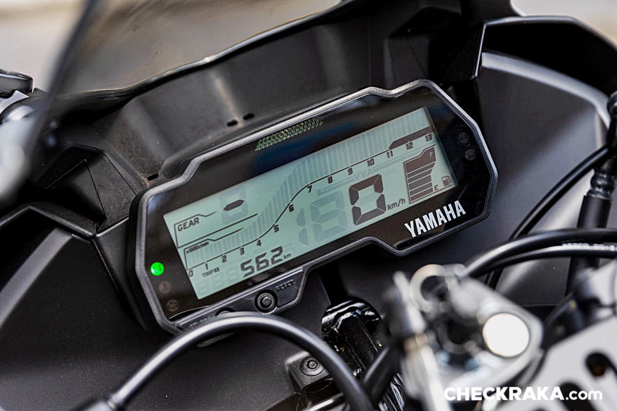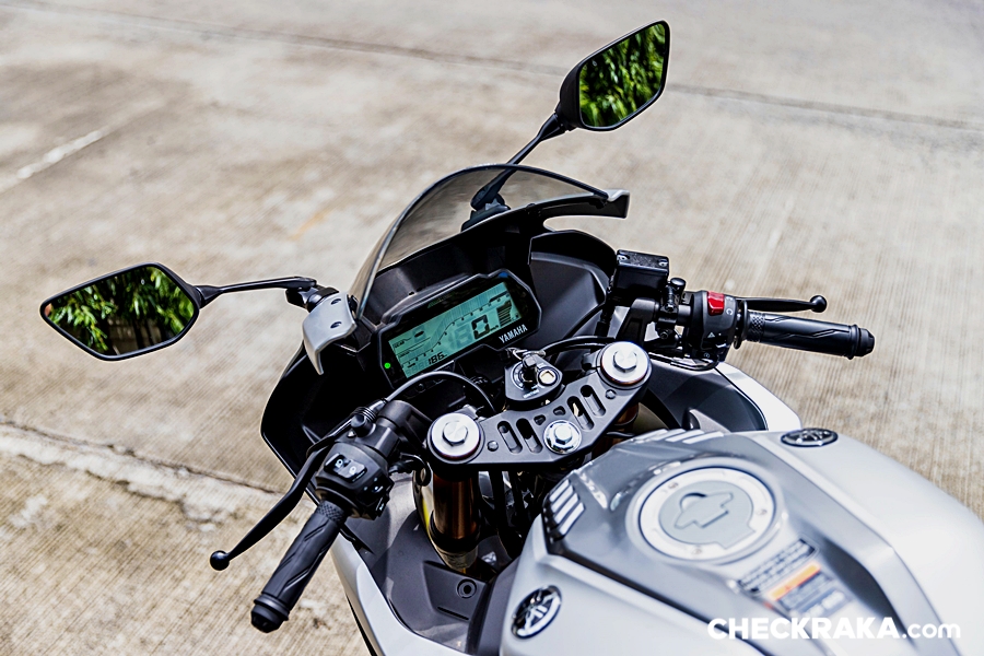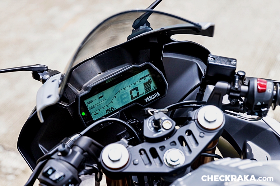 ตัวมาตรวัด FULL LCD DIGITAL METER ของ Yamaha YZF-R15 มองชัดเจนเว้นช่วงที่มีแสงแดดตอนเที่ยงวันส่องก็จะสะท้อนมากหน่อย ส่วนไฟ Shift Light เมื่อเจอแดดจ้าก็จะมองไม่ค่อยเห็นเพราะสายตาอยู่กับด้านหน้าถนนมากกว่าครับ โดยรวมให้ลูกเล่นมาครบและทันสมัยมาก สวิตช์ใช้งานไฟสูง-ต่ำบนของแฮนด์ฝั่งซ้ายนับว่าสะดวกมาก สวิตช์ไฟเลี้ยวพอดีกับการใช้นิ้วโป้ง ส่วนฝั่งขวามีสวิตช์ไฟฉุกเฉินเพื่อความปลอดภัย