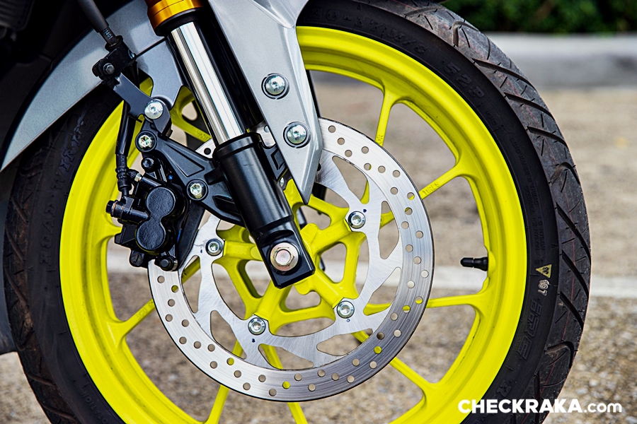 โช้คหน้าแบบหัวกลับสีทอง ดูดซับแรงได้ในระดับดี โช้คหลังเดี่ยวแบบกลไกแขน "สวิงอาร์ม" นุ่มนวลและตอบสนองการยุบและยืดตัวได้ระดับกลาง ๆ ไม่แข็งหรือนุ่มเกินไป เหมาะใช้งานในเมืองและขับในชีวิตประจำวันได้ไม่แข็งและดีดเกินไป และระบบดิกส์เบรกหน้าหลัง