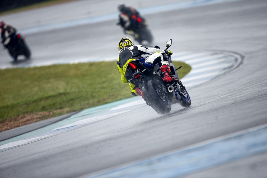 มิชชั่นการทดสอบขี่ ยามาฮ่า YZF-R7 ออนแทร็ค ถูกกำหนดขี่แบบวันเดียวแบ่งเป็น 5 กลุ่ม แต่ละกลุ่มมี 7 คัน (สื่อ) ได้รันกลุ่มละ 2 เซสชั่น ผู้เขียนอยู่ในกลุ่ม 2 แต่จากความตั้งใจทดสอบรถสแตนดาร์ดบนแทร็กแห้งกลายเป็นต้องรันบนแทร็คเปียกเพราะมีฝนตกลงมาก่อนหน้าและตลอดวันทดสอบ อย่างไรก็ตามทางเจ้าหน้าที่สนามและนักแข่งทีมยามาฮ่าได้ร่วมตรวจสอบสภาพสนามอยู่ตลอดเวลาเพื่อความปลอดภัยจริงๆ ของผู้ร่วมทดสอบทำให้ดีเลย์ไปบ้าง แต่สุดท้ายกลุ่มแรกก็ได้ไฟเขียวให้ออก การขี่ของแต่ละกลุ่มได้เวลา 15 นาที ต่อเซสชั่น ช่วงแรกทางทีมผู้จัดได้ให้ผู้ฝึกสอนมานำไลน์เสมือนวอร์มอัพแล็บ 2 รอบ แล้วจึงปล่อยให้วิ่งได้แบบอิสระ จนถึงคิวกลุ่ม 2 ของผู้เขียนที่ค่อนข้างกังวลกับสภาพสนามที่ยังเจิ่งนองด้วยน้ำ และฝนก็ยังพรำไม่หยุด ข้อควรระวังสำคัญในการขี่รถบนแทร็คของสนามช้างอินเตอร์เนชั่นแนลแบบนี้ก็คือ อย่าให้หลุดไปจนถึงขอบเคิร์บเพราะสีที่ทาไว้จะทำให้ยางสลิปได้ง่ายมาก และรถรุ่นนี้ไม่มีระบบแทร็คชันคอนโทรลทำให้ต้องเน้นเรื่องการเปิดคันเร่งออกจากโค้งให้มากขึ้นด้วย ผู้เขียนเพิ่งขี่ยามาฮ่า R7 เป็นครั้งแรกก็เจอความท้าทายเลย เรียกว่าไปทำความรู้จักกันในสนาม ช่วงแรกก็มีผู้ฝึกสอนนำไลน์ขี่เหมือนรอบวอร์มอัพ ผู้เขียนพยายามวอร์มหน้ายางตั้งแต่ขี่ออกจากพิท รวมไปทั้งวอร์มผ้าเบรกหน้าให้ถึงอุณหภูมิที่พร้อมทำงาน ช่วง 2 รอบแรกรู้สึกได้ถึงท่านั่ง โพซิชั่น ไรด์ดิ้ง ยังให้ความเป็นซูเปอร์สปอร์ตคล้ายกับรุ่นพี่ R6 ด้วยข้อมูลที่ได้จากทีมงานบริฟก่อนลงทดสอบ คือ ตำแหน่งแฮนด์ของ R7 นั้นอยู่สูงกว่า R6 นิดเดียว และไม่สูงเหมือน R3 ที่เป็นสปอร์ตทัวร์ริ่งมากกว่า นั่นทำให้เข้าใจได้ชัดเจนว่า R7 ถูกวางตำแหน่งการใช้งานไว้ทั้งบนถนนและแทร็คแบบสมดุล เริ่มจากทดสอบขี่ไปได้ลองจับอาการตอนเข้าโค้ง เร่ง และชะลอเบาเบรกตลอดจนการลดเกียร์แบบทีละจังหวะ ทั้งหมดให้การตอบสนองที่ดีและเกิดความคุ้นชินได้ไว รู้สึกได้ว่า R7 เป็นรถที่ขี่ในแทร็คง่ายตั้งแต่แรก ยิ่งใช้ยางมัลติคอมปาวด์รุ่นท็อป และสลิปเปอร์คลัตช์ทำให้การขี่ก่อนและขณะเข้าโค้งทำได้มั่นใจมากขึ้นตามรอบที่ขี่ ผู้เขียนใช้เวลาขี่ในเซสชั่นแรกเพื่อทำความเข้าใจการใช้เกียร์ คันเร่ง ในโค้งต่างๆ และจับอาการที่ต้องระวัง พอสรุปช่วงแรกได้ว่าด้วยกำลังของ R7 ระดับ 73 แรงม้าที่รอบ 8,750 รอบต่อนาที ให้อัตราเร่งที่ดีควบคุมง่าย เหมาะสำหรับการขี่แทร็คเดย์เพื่อประสบการณ์และความสนุก การไม่มีแทร็คชันไม่ใช่ประเด็นที่ต้องกังวลสำหรับพลั