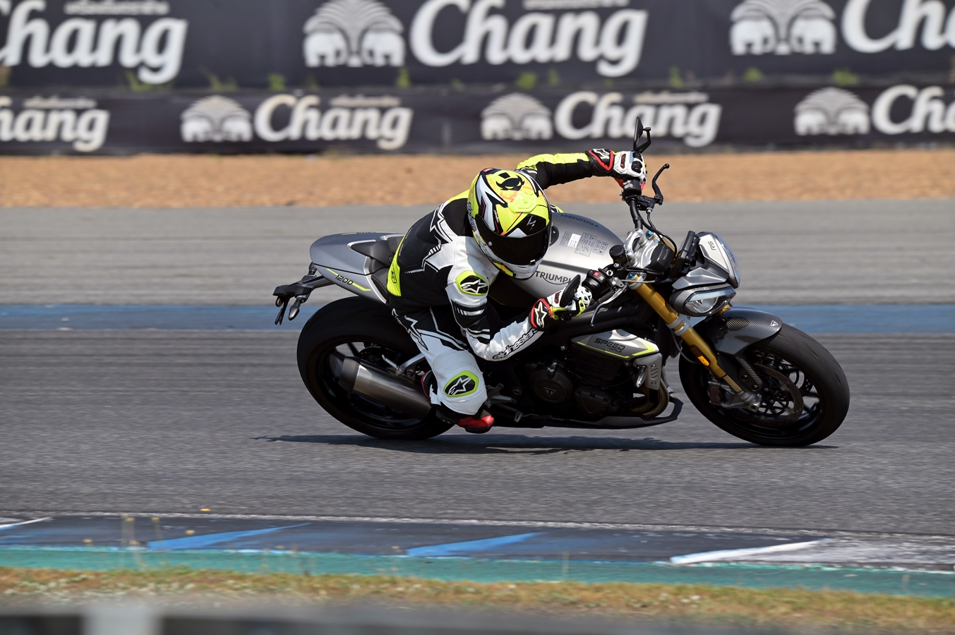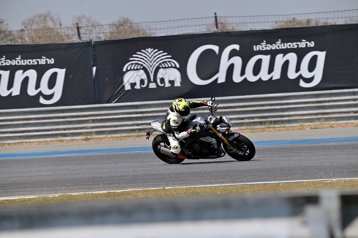 เมื่อสตาร์ทเครื่องพร้อมออกจากพิตเลนเสียงรอบเดินเบาของเครื่องยนต์ 3 สูบ ขนาด 1,160 ซีซี 180 แรงม้า ไม่ถึงกับดังจนปลุกเร้าอารมณ์มากนัก ผู้เขียนเดินคันเร่งออกไปแบบนุ่มนวลตามความเร็วที่กำหนด และระวังเรื่องอุณหภูมิยางที่ไม่ได้ผ้าห่มอุ่นยางมาก่อนขี่ รวมทั้งรถเองก็ใหม่มากเหมือนออกจากโรงานก็ขนมาลงสนามกันเลย เซสชั่นแรกจึงแค่ขี่ให้ชินกับท่านั่ง การตอบสนองของแรงบิด เกียร์ควิกชิฟต์ และเบรก เวลา 10 นาทีนับว่าไม่นาน จบเซสชั่นแรกด้วยความรู้สึกเหมือนที่คาดไว้แรงบิดของเครื่องยนต์มาดีและไวตามสไตล์ไทรอัมพ์ เบรกชะลอหยุดให้น้ำหนักและฟิลลิ่งตอบกลับที่นุ่มนวลทรงพลัง แต่เสียงไม่เร้าใจเหมือนพวกสปอร์ตไบค์รอบจัด อย่างไรก็ตามจัดว่าเป็นรถที่ขี่ง่าย แต่ตอนหมอบหลบลมพบว่าชิลด์หน้าแบบนี้ยาวมาจนใกล้หมวกและเผลอกระแทกในบางจังหวะถ้าไม่ระวัง ในใจคิดว่าไม่น่าเป็นรถสำหรับแทร็คเต็มตัวอาจไว้สำหรับบิดสนุกบนถนนไฮเวย์เปิดโล่ง แต่ในบ้านเราจะมีถนนเนียนๆ ทำความเร็วได้แบบนั้นหรือเปล่า