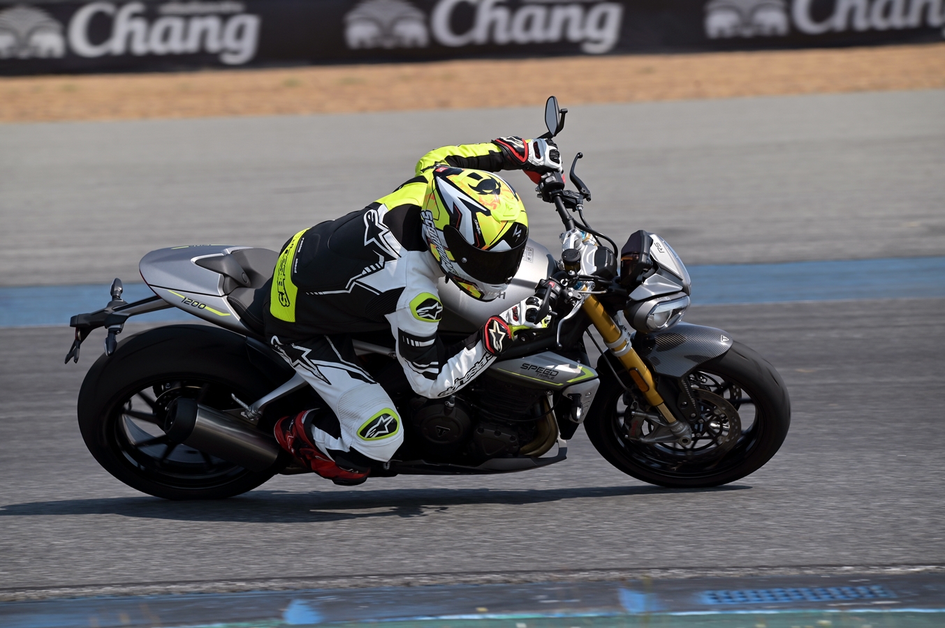 หลังจากเปิดตัวไปไม่นานทาง ไทรอัมพ์ มอเตอร์ไซเคิลส์ ก็จัดให้สื่อมวลชนได้สัมผัสสมรรถนะจริงของตัวรถทั้ง 2 รุ่น แบบเต็มที่ในแทร็คของสนามช้างฯ โดยการทดสอบแบ่งออกเป็น 3 เชสชั่น และแบ่งกลุ่มทดสอบออกเป็น 3 กลุ่มตามจำนวนสื่อมวลชนและอินฟลูเอนเซอร์ที่ร่วมขี่ในครั้งนี้ ผู้เขียนอยู่ในกลุ่ม 2 หลังฟังบรรยายรายละเอียดตัวรถในช่วงเช้าของทั้ง สปีด ทริปเปิล 1200 อาร์อาร์ และสปีด ทริปเปิล 1200 อาร์เอส ซึ่งแม้มีพิ้นฐานเครื่องยนต์ เฟรม และโครงสร้างช่วงล่างที่เหมือนกัน แต่ก็มีความแตกต่างกันในแง่รูปลักษณ์ ประเภทรถ และรายละเอียดพาร์ตมากพอสมควร รวมไปถึงราคาที่ต่างกัน 100,000 บาท