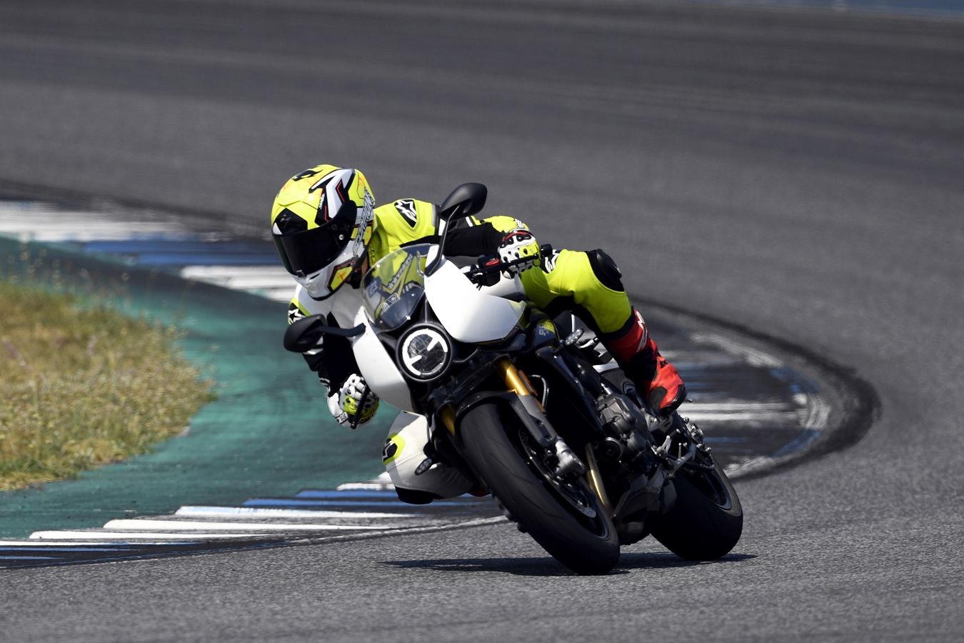 ผู้เขียนเริ่มต้นเซสชันแรกกับ สปีด ทริปเปิล 1200 อาร์อาร์ สีขาว มีเวลา 10 นาที ก่อนหน้าก็ยังไม่เคยขี่เรียกว่าลงไปทำความรู้จักรถในสนามเลยทีเดียว ต้องพยายามทำความคุ้นชินกับรถให้ไวที่สุดเพื่อได้ลองสัมผัสสมรรถนะได้อย่างทีต้องการ ด้วยประสบการณ์ที่เคยขี่แต่สปอร์ตไบค์หลากหลายคลาสในแทร็ค เมื่อต้องมาขี่ สปีด ทริปเปิล 1200 อาร์อาร์ รูปทรงมีเอกลักษณ์เฉพาะดูไม่ใช่ซูเปอร์ไบค์ และก็ไม่ใช่เน็กเกดเพราะนั่นมี อาร์เอส อารมณ์คาเฟ่ เรเซอร์ ภายใต้ความเป็นเนกเกตไบค์ แตกต่างตรงตำแหน่งแฮนด์บาร์ที่ต่ำและลีนไปข้างหน้ามากกว่า รวมไปถึงที่พักเท้าอยู่สูงและล่นไปด้านหลังมากกว่าตัวอาร์เอส ทำให้ท่านั่งสปอร์ตมากกว่า แต่ก็ไม่เหมือนกับซูเปอร์ไบค์แท้ๆ จุดเริ่มต้นกับรถที่พิตมีเวลาไม่มาก การไล่เซ็ตค่าต่างๆ ทำได้แค่เพียงโหมดสปอร์ต ก่อนหน้าที่จะมาขี่ในแทร็คตอนลองเข็นเพื่อถ่ายรูปก็พบว่ากุญแจคีย์เลสให้ความสะดวกไม่น้อย ฝาถังน้ำมันก็คีย์เลสด้วย แต่ทำให้การสตาร์ทระบบนานไปจนสังเกตุได้มีอย่างน้อยก็น่า 2 วินาที พอให้คิดว่ามันโอเคใช่ไหม กว่าจะได้เห็นภาพกราฟฟิกปรากฎบนเรือนไมล์