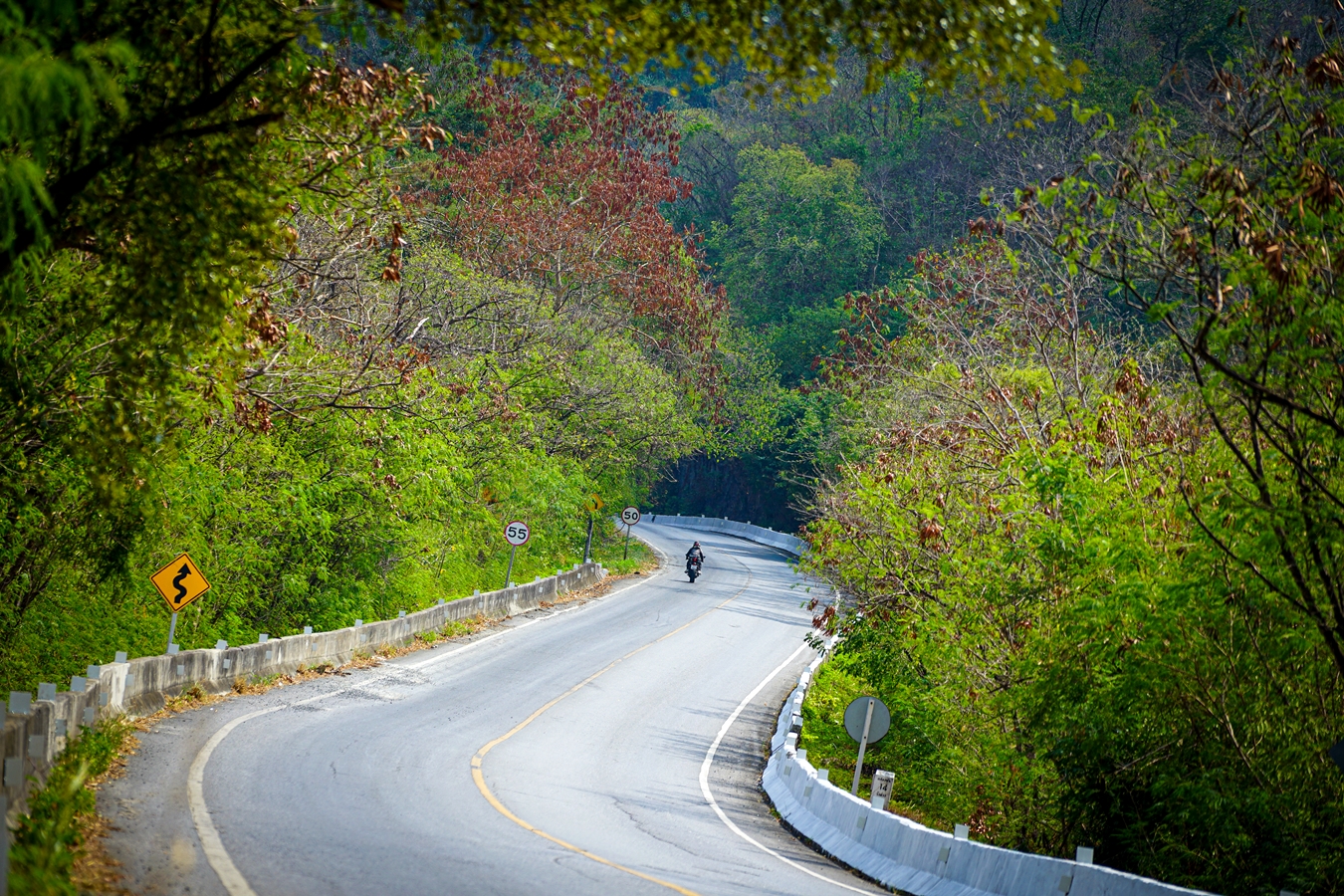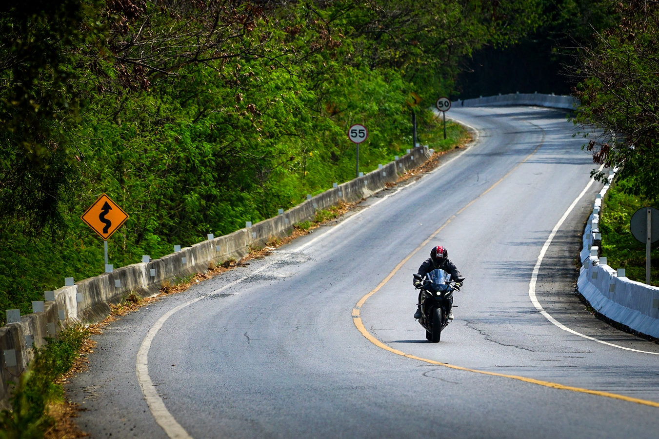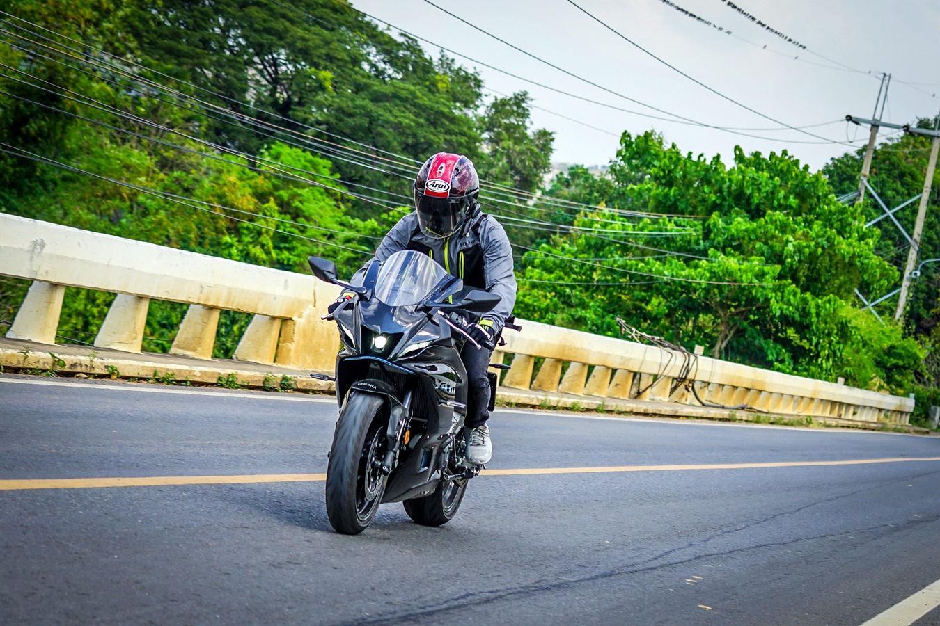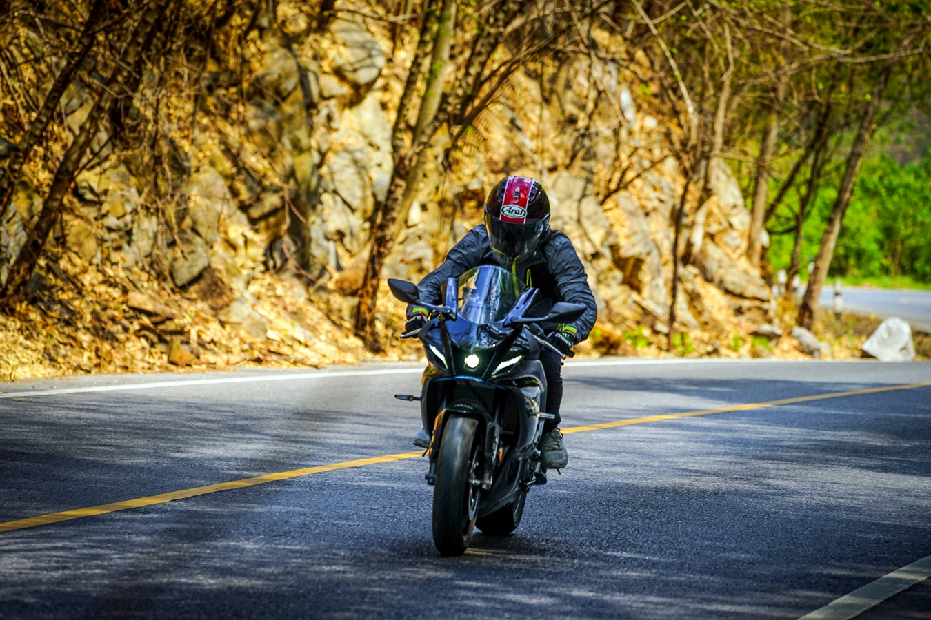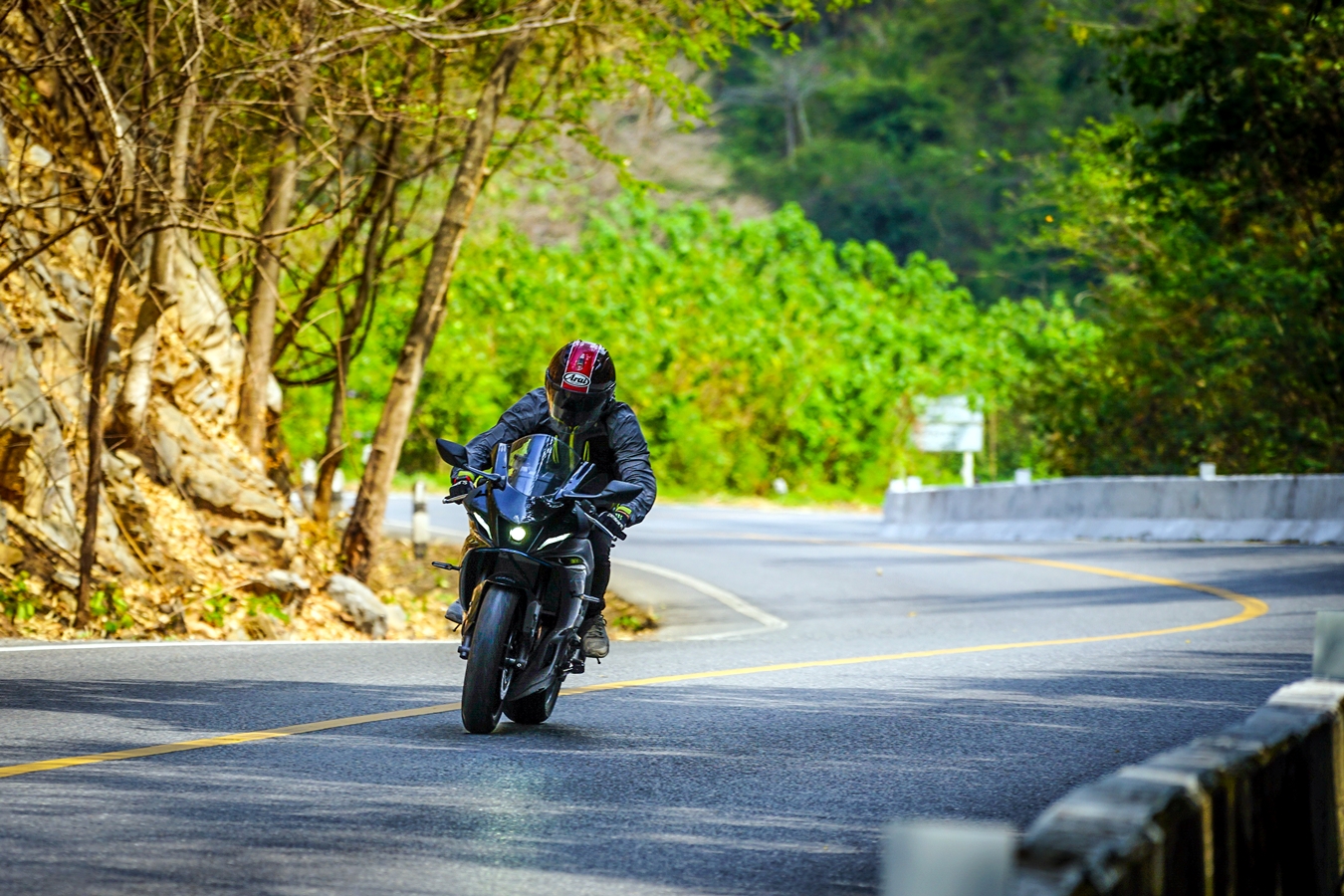 วันที่สองของการขี่ไปกับยามาฮ่า R7 สตาร์ทจากนอร์ธปาร์คย่านงามวงศ์วานในช่วงเช้ามุ่งหน้าสระบุรี โดยแวะเจอกับเพื่อนร่วมทริปทีมงานเพจ Just Ride It ที่แมคโดนัลด์ไดร์ฟทรู วังน้อย จุดหมายแรกคือ น้ำตกเจ็ดสาวน้อย โดยช่วงแรกใช้เส้นทางหลักถนนพหลโยธินเข้าสู่สระบุรีแล้วขี่ต่อไปตามถนนมิตรภาพ นับเป็นช่วงขี่บนถนนเปิดโล่งทางไกล ความเร็วที่ใช้เดินทางอยู่ในช่วง 120 กม./ชม. บวกลบ ระบบเบรกใช้ไม่บ่อยเพียงแค่ชะลอเบา ต่อด้วยการแฮนด์ลิ่งหลบเปลี่ยนเลน เพื่อเร่งแซงรถช้า จุดนี้พลัง 75 แรงม้า จากเครื่องยนต์ขนาด 689 ซีซี มีบทบาทชัดเจนเพราะมีจังหวะเปิดคันเร่งแบบทันทีทันใดบ่อยครั้ง แรงบิดขนาด 67 นิวตันเมตร ที่ 6,500 รอบต่อนาที ดึงดีตั้งแต่รอบต้น-กลาง ทำให้ง่ายต่อการขี่แบบนี้ ผู้เขียนเริ่มคุ้นชินกับท่าขี่ ความเมื่อยล้าแบบวันแรกไม่มีแล้ว นับเป็นเรื่องแปลกใจอยู่ไม่น้อย จนมาถึงช่วงที่ตัดเข้ามวกเหล็ก ขี่ไปตามถนนสายรอง 2224 เจอโค้งลับตาหลายช่วง ทางส่วนใหญ่เป็นทางโล่ง ไม่ค่อยมีรถสัญจรผ่านมากนัก แต่ก็ใช้ความเร็วไม่ได้มากระดับ 80-100 กม./ชม. เพราะพื้นผิวมีทรายและกรวด ส่วนหนึ่งก็เพราะพื้นที่รอบข้างเป็นธรรมชาติและรถไม่ค่อยวิ่ง