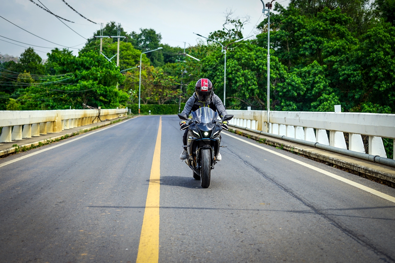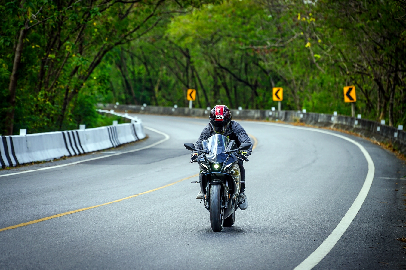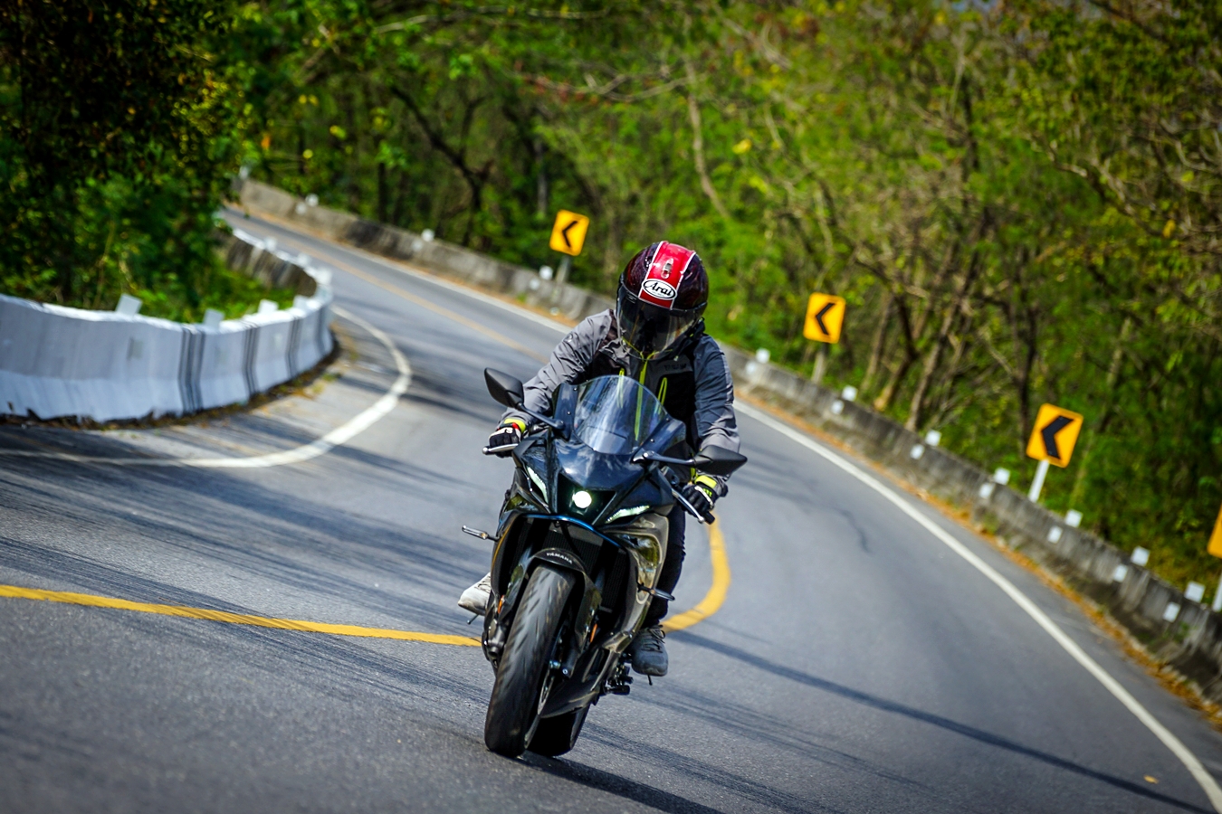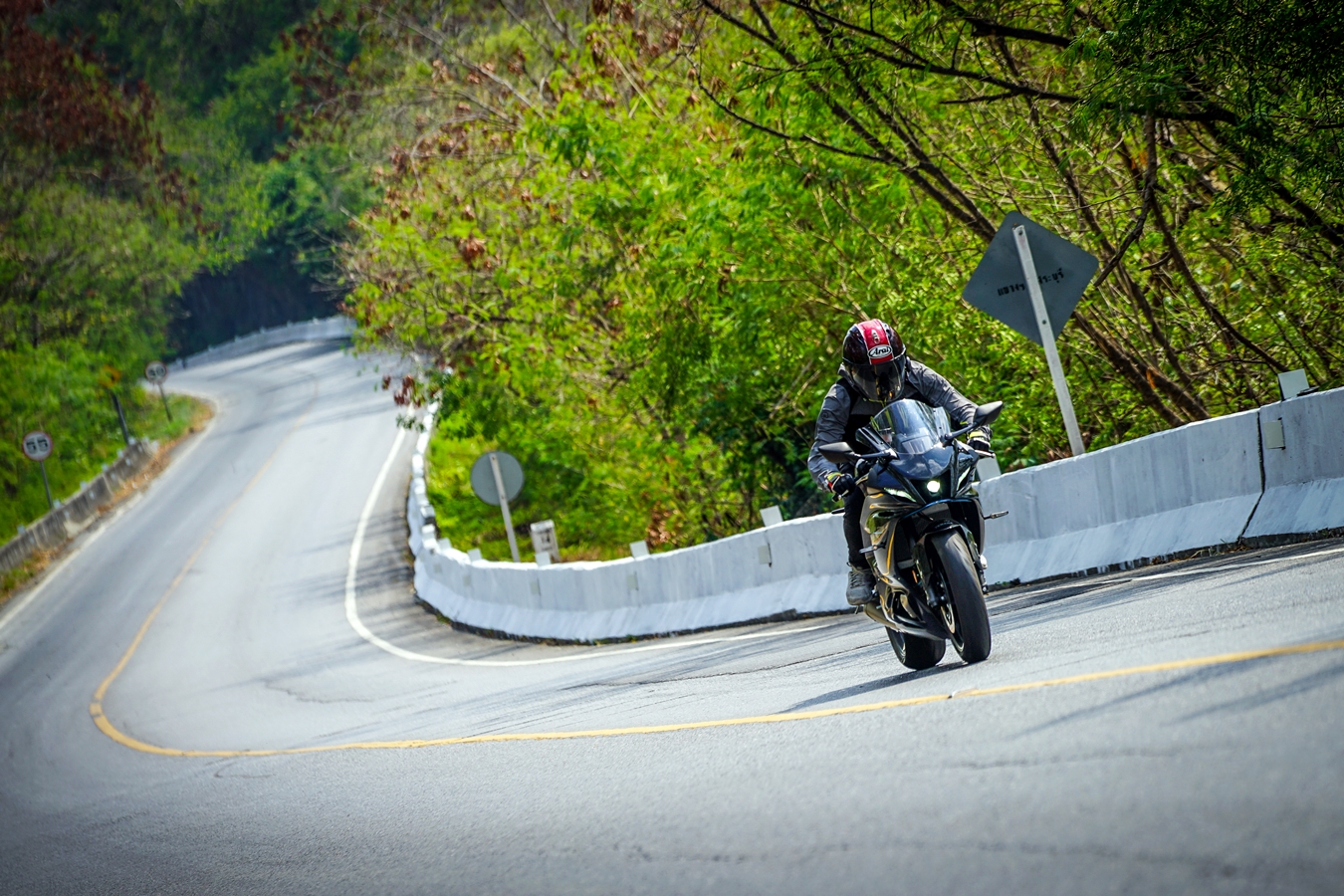 วันแรกของการรับรถผู้เขียนที่เคยขี่มาครั้งก่อนในสนามช้างฯ ถือว่าทำความคุ้นเคยกันรถมาแล้ว แต่การขี่ในสนามที่เน้นด้านสมรรถนะล้วนๆ การโฟกัสในรายละเอียดย่อมแตกต่างไปจากการนำมาขี่ทดสอบบนถนนจริงที่มีตัวแปรมากมาย การขี่ในวันแรกเป็นการทำความคุ้นชินกับการบังคับควบคุมรถบนถนน ซึ่งต่างไปจากขี่ในสนามโดยสิ้นเชิงเพราะต้องระวังรอบด้าน ใช้กระจกมองข้าง เกียร์ชิฟขึ้น-ลง เบรกบ่อยครั้ง และการรันอินร่างกายไปกับท่านั่งตัวรถ ซึ่งวันแรกที่ขี่ช่วงสั้นๆ เป็นระยะทางราว 20 กม. ยอมรับเลยว่าไม่ชินและปวดเมื่อยอยู่บ้าง แต่โดยรวมการตอบสนองของรถในการใช้งานบนถนนในเมืองที่การจราจรพลุกพล่านก็นับว่าขี่ง่ายอยู่ เพียงแต่ซอกแซกลำบากด้วยบอดี้แบบสปอร์ตไบค์ น้ำมันที่เติมเพื่อการเดินทางไกลในวันที่สองใช้ก๊าซโซฮอล 95 สำหรับการขี่ทดสอบครั้งนี้