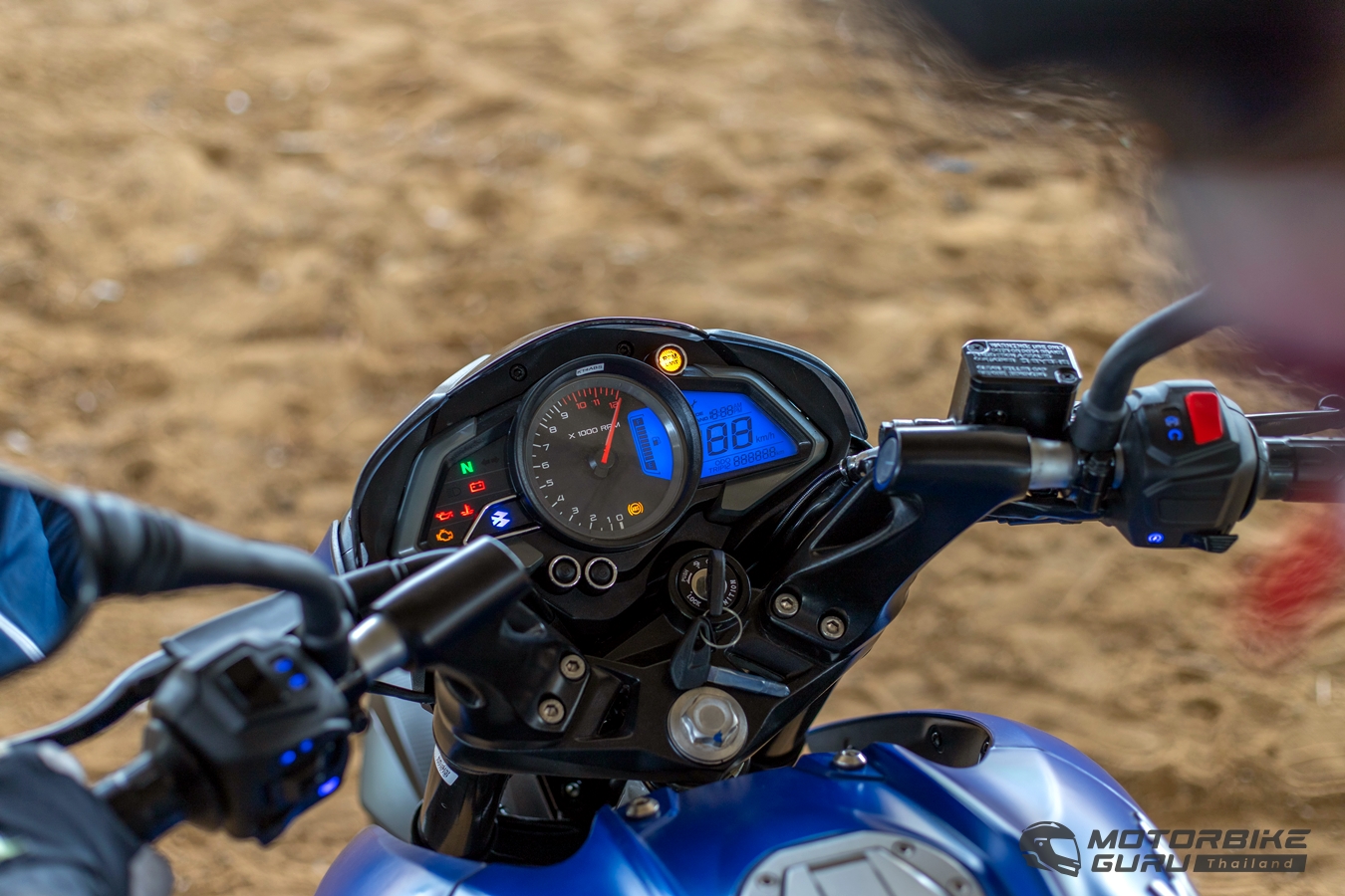 เรือนไมล์มองง่ายชัดเจน มีสีสันและลูกเล่นพอสมควร ปุ่มการใช้งานต่างๆ ทั้งสองฝั่งแฺฮนด์ใช้ง่าย คล่องมือ ถังน้ำมันขนาด 12 ลิตร เติมเต็มถังขี่เที่ยวทางไกลได้ยาวๆ พักเท้าตำแหน่งกำลังดีสำหรับมาตรฐานคนไทยสูง 170 ซม. +/- เบาะนั่งกระชับ นุ่มกำลังพอเหมาะรับน้ำหนัก 65 กก. ของผู้เขียนได้สบายๆ ทั้งวัน ที่ไม่เหมือนใครคือ มีแคลชบาร์แยกทั้งสองข้างช่วยให้มีพื้นที่เซฟตี้เพิ่มสำหรับผู้ขี่เวลาล้มและลดความเสียหายของตัวรถได้