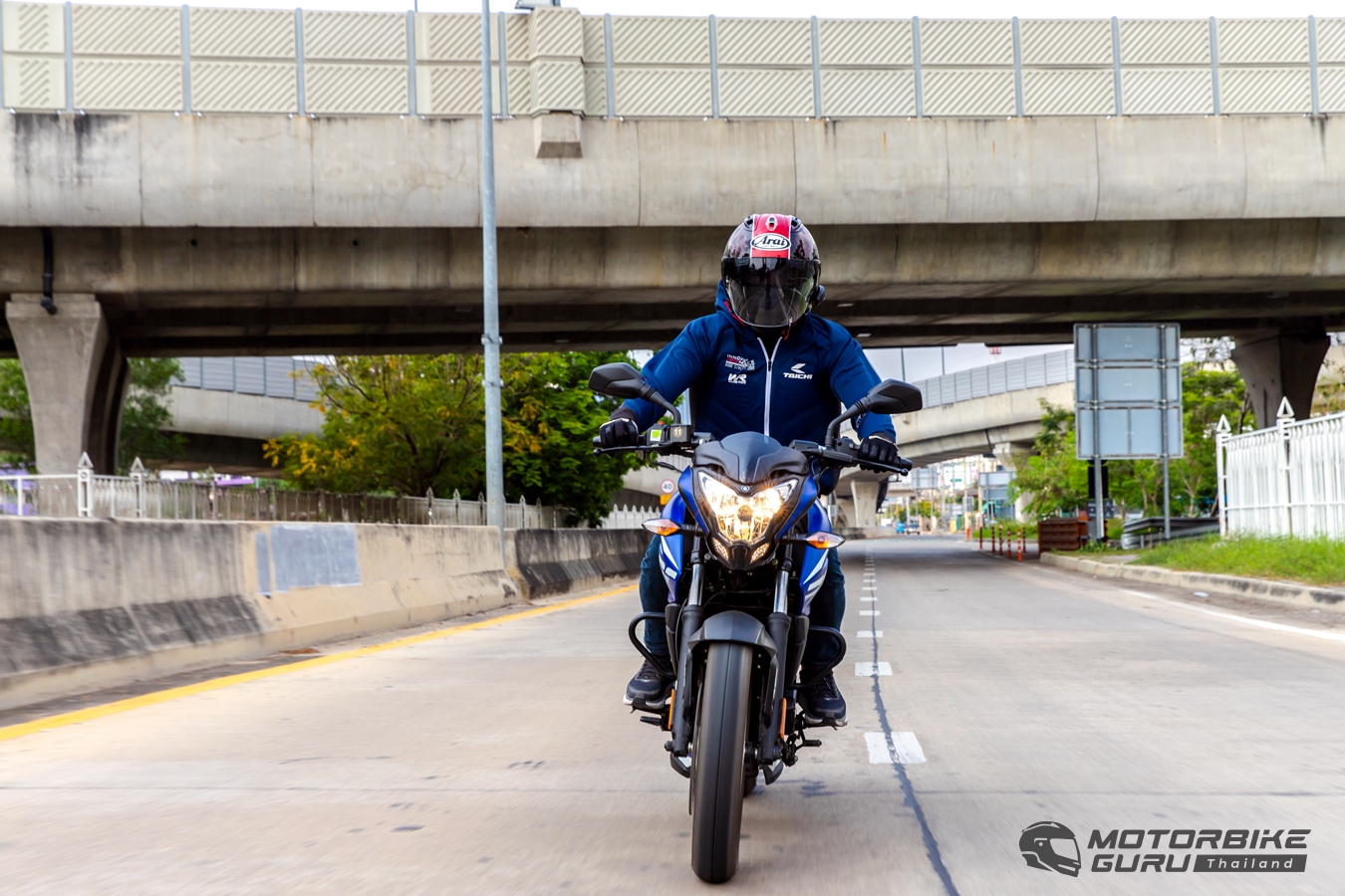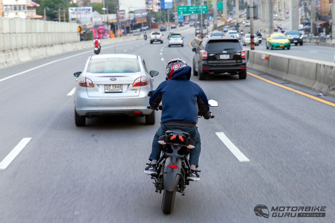 การขี่ช่วงแรกเริ่มต้นกับถนนลาดพร้าวฝ่าการจราจรติดขัดช่วงกลางวันและลุยกับสภาพถนนที่อยู่ในระหว่างก่อสร้างรถไฟฟ้าสาธารณะ จุดหมายปลายทางแรกคือ ปั๊มน้ำมัน การขี่ด้วยความเร็วต่ำสลับหยุดนิ่งและต้องซอกแซกดูเหมือนเป็นการเข้าเรื่องที่รวดเร็วจนไม่ทันตั้งตัวเพราะยังไม่คุ้นชินกับรถ อย่างไรก็ตามเครื่องยนต์ตอบสนองดีให้กำลังมาตั้งแต่รอบต้น เกียร์ 2 ใช้งานได้ครอบคลุมการขี่ความเร็วต่ำ หน้ารถเวลาหักเลี้ยวรู้สึกหน่วงและหนักอยู่บ้าง แต่โดยรวมก็ซอกแซกผ่านช่องแคบระหว่างรถยนต์ไปได้เรื่อยๆ แม้ไม่ชินกับมิติความกว้างตัวรถก็ตาม