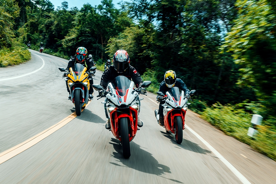 อีกเรื่องสำคัญคือ จุดเบรก ! เป็นมายเซ็ตที่ต่างกันมากระหว่างแทร็คกับถนน ในสนามแข่งตอนขี่แทร็คเดย์คุณอาจจุ่มเบรกได้ลึก เข้าไลน์เดิมได้ครั้งแล้วครั้งเล่าผ่านจุดตัดโค้งได้เป๊ะทุกรอบตามชั่วโมงบิน แต่บนถนนหลวงมันเป็นเคสที่ต่างกันลิบลับ อยางแรกคือ ต้องใช้เบรกเร็วขึ้นก่อนเข้าโค้ง เปิดไลน์เข้าโค้งใหม่ที่มองเห็นทะลุโค้งได้เยอะที่สุด เลี่ยงการมองแบบเล็งจุดตัดผ่าน เบรกมีแล้วต้องใช้ การให้น้ำหนักเบรกที่เหมาะสมก่อนและระหว่างเข้าโค้งเป็นเรื่องสำคัญ ก่อนเข้าใช้เบรกแบบค่อยๆ เพิ่มน้ำหนักทั้งหน้าและหลัง หน้าสำคัญเพราะเป็นพลังการหยุดตัวรถที่แท้จริงและช่วยถ่ายน้ำหนักไปด้านหน้าเพื่อให้รถเข้าโค้งได้ง่ายขึ้น เมื่อเข้าสู่โค้งก็ค่อยๆ ผ่อนเบรกพร้อมลีนเข้าเพื่อได้แทร็คชัน ค่อยๆ เติมความเร็ว ออกโค้งไปอย่างไหลลื่นแบบที่คุมได้ บนถนนการเบรกควรชะลอลดความเร็วลงมาเพื่อการเข้าโค้งที่ง่าย ควบคุมได้เสมอ รวมไปถึงวิเคราะห์จากสภาพแวดล้อมตอนนั้นด้วย รถยนต์ขับตามหลัง มีรถสวนตลอด พื้นผิวถนนลื่นไหม และที่อันตรายสุดๆ ทั้งบนแทร็คและถนนคือ การเบรกฉุกเฉิน เบรกตกใจ ในแทร็คคุณอาจเลยจุดเบรกก่อนเลี้ยวและมาด้วยความเร็วที่ไม่สามารถเลี้ยวได้แล้ว นั่นก็ต้องประคองรถและเบรกให้ได้เร็วที่สุดก่อนหลุดทะลุแทร็คออกไปไกล บนถนนไม่ว่ารถ คน สุนัข ที่ตัดหน้า นั่นทำให้เราต้องพร้อมเบรกแบบหยุดให้สั้นที่สุด ดังนั้นมือขวาก็ต้องพร้อมกดก้านเบรกหน้าตลอดเวลา และเมื่อถึงคราวที่ต้องออกแรงกดเต็มแรงจริงๆ แขนทั้งสองข้างก็ต้องเหยียดตรงช่วยยันแฮนด์ไว้ด้วย บางคนใช้เวลาที่น้อยนิดในการเบรกไปกดบีบแตรซึ่งจริงๆ แทบไม่ได้ช่วยอะไรให้ดีขึ้น นอกจากเสียเวลาเบรกเพิ่ม หยุดจนปลอดภัยก่อน แล้วอยากกดแตรหรือตะโกนว่าตามทีหลังดีกว่า