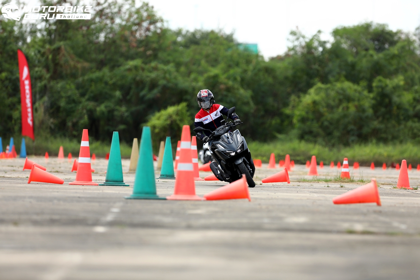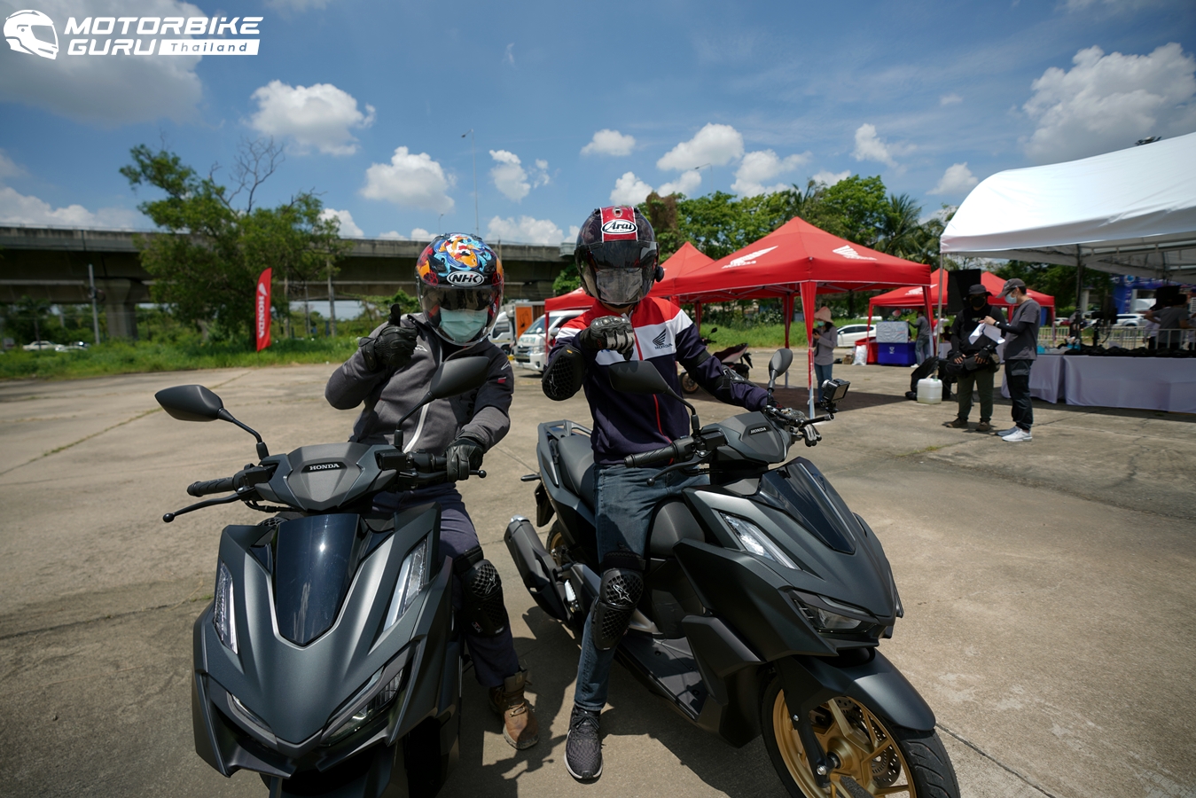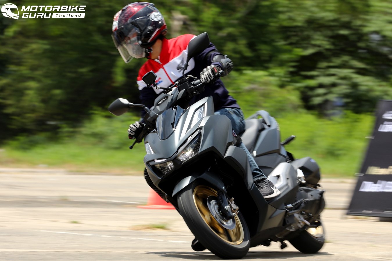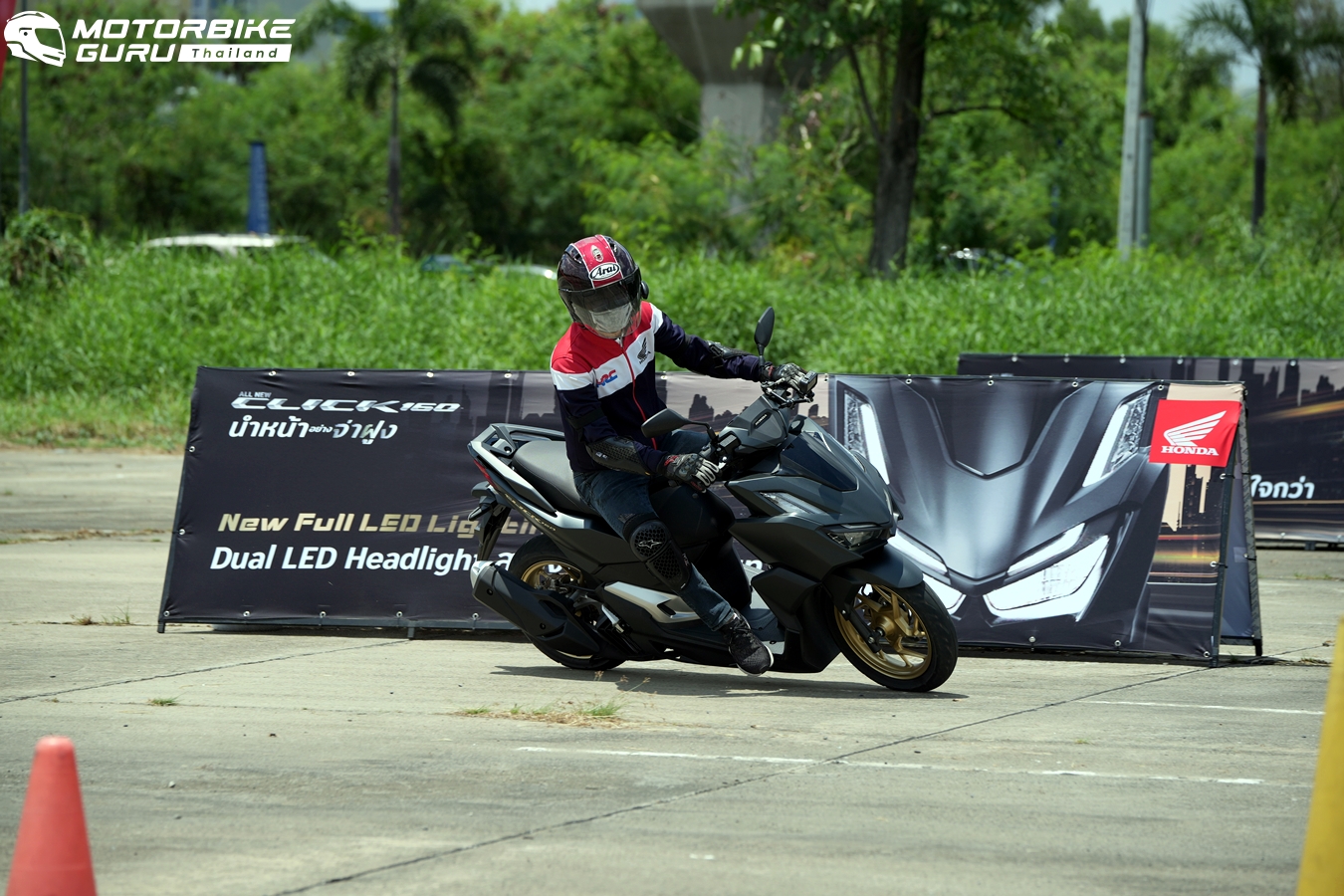 ด้านการเลี้ยวเข้าออกโค้งยูเทิร์นสามารถลีนได้จนขาตั้งครูดโดยตัวรถไม่มีอาการใดๆ ให้กังวล ยางติดรถก็ทำหน้าที่ได้ดีไม่น้อย การเลี้ยวเข้ากรวยสลาลอมเติมยกสลับได้อย่างสนุก มาถึงจุดสำคัญคือ การเบรกบนพื้นผิวทรายที่เทกระจายรอบ แม้เป็น ABS หน้า แต่ระบบก็ทำงานสะท้อนขึ้นมาให้ได้รู้สึกและไหลหยุดได้สั้นจริง ผู้เขียนลองกระแทกคันเร่งออกตัวแบบทันทีบนพื้นผิวทราย ตั้งใจให้ล้อหลังเสียแทร็คชันเพื่อจับอาการว่ารถคลาสนี้ที่ไม่มี แทร็คชัน คอนโทรล จะตอบสนองเวลาออกตัวบนพื้นลื่นอย่างไร ก็พบว่าล้อหลังที่เริ่มฟรีจนท้ายรถเริ่มดันออกข้างให้รู้สึก ก็สวยด้วยการยกคันเร่งจนรถเริ่มทรงตัวตรงแล้วเปิดคันเร่งไปต่อได้แบบสบายๆ การขี่ทดสอบ 20 นาที เน้นไปที่เรื่องของสมรรถนะตัวรถเป็นหลักซึ่ง All New Click 160 ทำได้เต็มกราฟจากความรู้สึกที่ได้ขี่เทียบกับกลุ่มรถขนาดไม่เกิน 160 ซีซี ในราคาไม่เกิน 7 หมื่นบาท ส่วนเรื่องอรรถประโยชน์ อัตราสิ้นเปลือง ความสบายในการขี่แบบในและนอกเมืองคงต้องไว้รอทดสอบขี่กันแบบออกทริปในโอกาสต่อไป