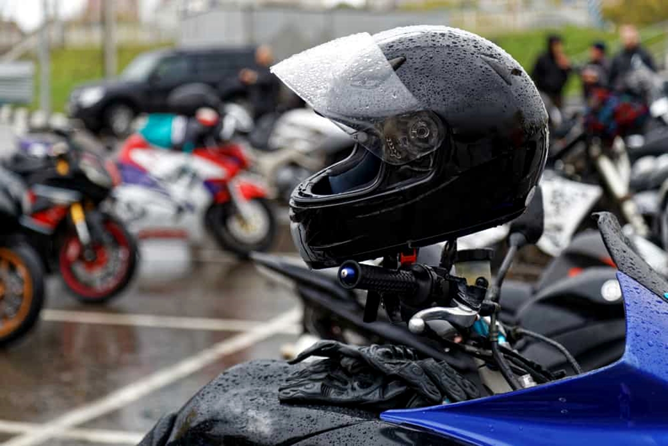 หมวกกันน็อคทั่วไปมักมีรูระบายอากาศก็ควรปิด และชิลด์หน้าแนะนำแบบใสหรือที่ให้ติดหมวกมาตั้งแต่แรก หลายคนอาจเป็นเปลี่ยนชิลด์ดำหรือปรอท ถ้าขี่ลุยฝนแบบครึ้มๆ นี่หายนะแน่นอน และก็ควรใส่แผ่นกันฝ้า (Pinlock) ไว้ด้วย หมวกแบรนด์ชั้นนำมักให้ติดมาด้วย สุดท้ายหาเสื้อผ้าสำรองใส่กล่องหรือเป้กันน้ำไว้สำรองเปลี่ยน
