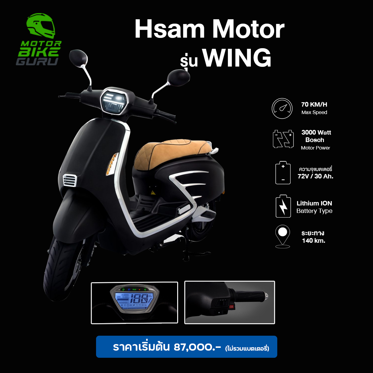 Hsam Motor รุ่น Wing มาพร้อมดีไซน์แบบ Luxury หรูหราด้วยขอบโครเมียม และไฟ LED รอบคัน หน้าปัดเรือนไมล์แบบดิจิตอล มีขนาดมอเตอร์ขนาด 3,000 วัตต์ จาก BOSCH Wing สามารถทำความเร็ซสูงสุดถึง 70 กม./ ชม. โหมดให้ปรับความเร็ว 3 ระดับ และสามารถทำระยะทางได้สูงสุด 140 กม. แบตเตอรี่จาก Samsung ที่มาพร้อมกับเทคโนโลยีลิเธียม ขนาด 72V30Ah ขับเคลื่อนด้วยระบบการจัดการแบตเตอรี่แบบ BMS ป้องกันไฟฟ้าลัดวงจร ระบบเบรก ดิสเบรก หน้า - หลัง และที่สำคัญเขามีฟังก์ชั่นสวิตช์ถอยหลังให้ด้วย ดูรายละเอียดทั้งหมด