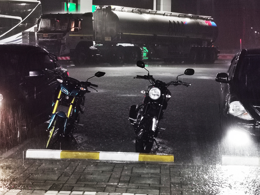 สภาพอากาศที่เย็นไม่ได้ส่งผลแค่ตัวผู้ขี่เท่านั้น ตัวรถเองก็เช่นกันซึ่งเป็นเรื่องสำคัญมากที่เราต้องเข้าใจการทำงานที่เปลี่ยนไป อย่างยางที่เนื้อยางจะแข็งกว่าปกตินั่นหมายถึงแทร็คชั่นที่ลดลงด้วย การขี่เข้าโค้งด้วยการลีนเข้าแบบถนนแห้งต้องลดลง ขี่ด้วยความระวังมากกว่าปกติเพราะอากาศเย็นมากับความชื้น โดยเฉพาะบางส่วนของถนนที่ไม่โดนแดดอาจมีตะไคร่น้ำเกาะ ซึ่งอันตรายมาก อย่าลืมว่าระยะเบรก็ต้องมากกว่าถนนแห้งของหน้าร้อนด้วย สำหรับใครที่คิดว่าควรอุ่นยางช่วงเริ่มขี่แบบโยกซ้ายขวาเพื่อให้หน้ายางได้ทำงานทั่วถึง อาจต้องเปลี่ยนเป็นเร่งและยกจะดีกว่า อย่าลืมเรื่องแทร็คชั่นด้วยอาจต้องปิดก่อนและรู้ลิมิตว่าเร่งได้แค่ไหน ... แบตเตอรี่กับอากาศเย็นก็จะคลายประจุมากกว่าปกติ อย่าลืมว่าอายุการใช้งานของแบตฯ นานพอที่ต้องเปลี่ยนใหม่แล้วหรือยัง เพราะประสิทธิภาพแบตเก่าลดหลั่นไม่เต็มร้อยเปอร์เซนต์อยู่แล้ว