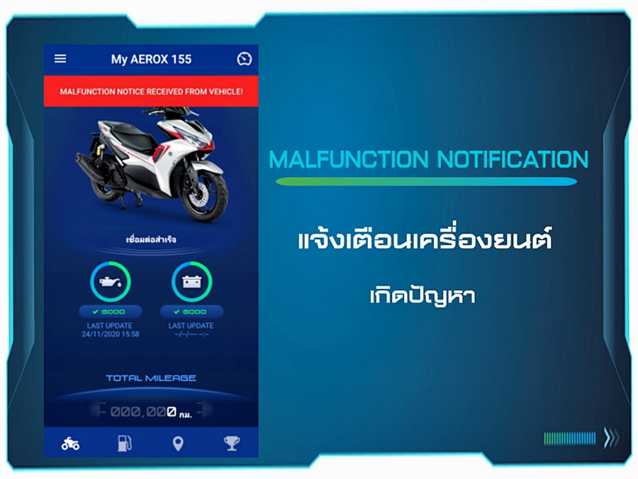 Yamaha Y-Connect Application เมื่อเครื่องยนต์มีความผิดปกติจะมีการแจ้งเตือนให้ทราบ โดยสามารถตั้งค่าให้ส่งข้อมูล สถานที่ เวลา และอื่นๆ แจ้งไปยังศูนย์บริการตัวแทนจำหน่ายยามาฮ่าที่กำหนดได้โดยอัตโนมัติ
