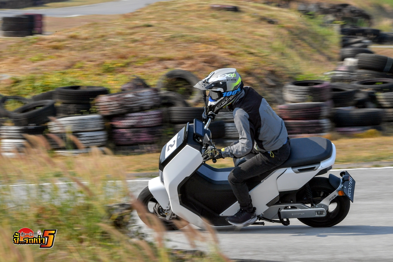 อย่างไรก็ตามครั้งนี้เป็นการลองสมรรถนะตัวรถในสนามแข่งจริงอย่าง แก่งกระจานเซอร์กิต ที่มีความยาวเต็มรอบอยู่ที่ 2.4 กม. และรอบสั้นอยู่ที่ 1.004 กม. ช่วงแรกได้ลงไปวอร์มอัพแบบฟูลแล็ปรอบใหญ่ 4 รอบสนาม เพื่อทำความคุ้นเคยกับตัวรถในหลายๆ ด้าน ทั้งการเดินคันเร่ง เบรก เข้าโค้ง และลองโหมดต่างๆ จนคุ้นชิน ซึ่งให้ความรู้สึกใกล้เคียงกับการขี่รถเครื่องยนต์สันดาปไม่น้อย จนมาถึงช่วงแข่งในรุ่น EV bike โดยเป็นการแข่ง 2 รอบสนามสั้น ทั้งหมดรวม 2.008 กม. ผู้เขียนปรับโหมดเป็นสปอร์ตสำหรับการแข่ง ตัวรถตอบสนองได้ดีตั้งแต่เปิดคันเร่งเต็มที่ การควบคุมตัวรถกับแทร็คที่มีปั้มขึ้นลงก็ดีเช่นกัน การชะลอเบาเบรกก่อนเข้าโค้ง ทำได้ดีกว่ารถสกู๊ตเตอร์สันดาปทั่วไปด้วย เพราะใช้เป็นระบบดิสก์เบรกหน้า-หลัง การเข้าโค้งความเร็วแคบๆ ยึดเกาะและเข้าไลน์ได้อย่างที่ต้องการ อาจต้องระวังองศาการลีนไม่ให้มากเกินไปจนขาตั้งครูด ซึ่งเป็นปกติของสกู๊ตเตอร์ การเข้าโค้งเอสสามารถถ่ายน้ำหนักและไปตามไลน์ได้อย่างไหลลื่น ช่วยให้ขี่สนุกเกินคาด มาถึงช่วงการเข้าโค้งยูเทิร์นกว้าง การเดินคันเร่งให้สมูธตลอดโค้งอาจต้องหาจังหวะดี โดยเฉพาะการรักษาระดับความเร็วที่ทำให้ตัวรถเกาะไลน์ได้อย่างถูกต้อง เมื่อบิดครบ 2 รอบ จนเข้าเส้นชัยเป็นคันแรก ตัวมอเตอร์ก็ยังตอบสนองได้สม่ำเสมอไม่มีตก แม้ว่าจะต้องทำงานหนักตลอด 2 รอบ ซึ่งบางยี่ห้ออาจมีปัญหาตรงนี้เมื่อแบตเตอรี่ร้อน นับเป็นความประทับใจในด้านสมรรถนะแบบสปอร์ตของ ECOOTER E5 แม้ได้ลองไม่มากนักแต่ก็เหมาะสมกับความเป็นสกู๊ตเตอร์ไฟฟ้าที่เน้นใช้งานในชีวิตประจำวันทั่วไป จากนี้คงต้องรอทดสอบการขี่บนถนนจริงในเมืองแบบเต็มวันอีกครั้ง เพื่อดูระยะทางขับเคลื่อนรวมที่ทำได้ต่อการชาร์จเต็ม