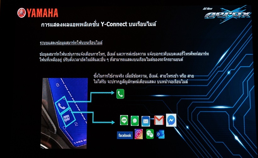 เทคโนโลยีใหม่ เหนือชั้นกับแอปพลิเคชัน Y-Connect เชื่อมต่อสมาร์ทโฟนผ่านแอปพลิเคชันที่เชื่อมต่อข้อมูลรถผ่าน CCU ช่วยให้ทราบข้อมูลสำคัญของรถและลักษณะการขี่นำขึ้นไปแสดงผลบนสมาร์ตโฟน และตัวแอปฯ เลือกดูได้ 9 เมนู คลอบคลุมทุกข้อมูลสำคัญดังนี้