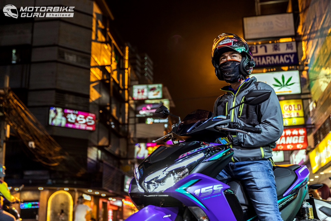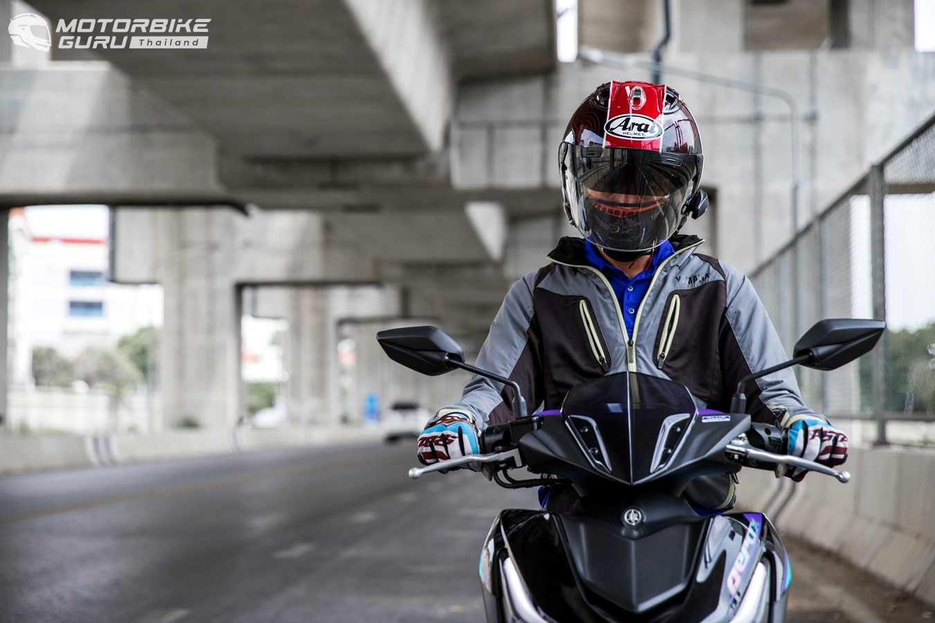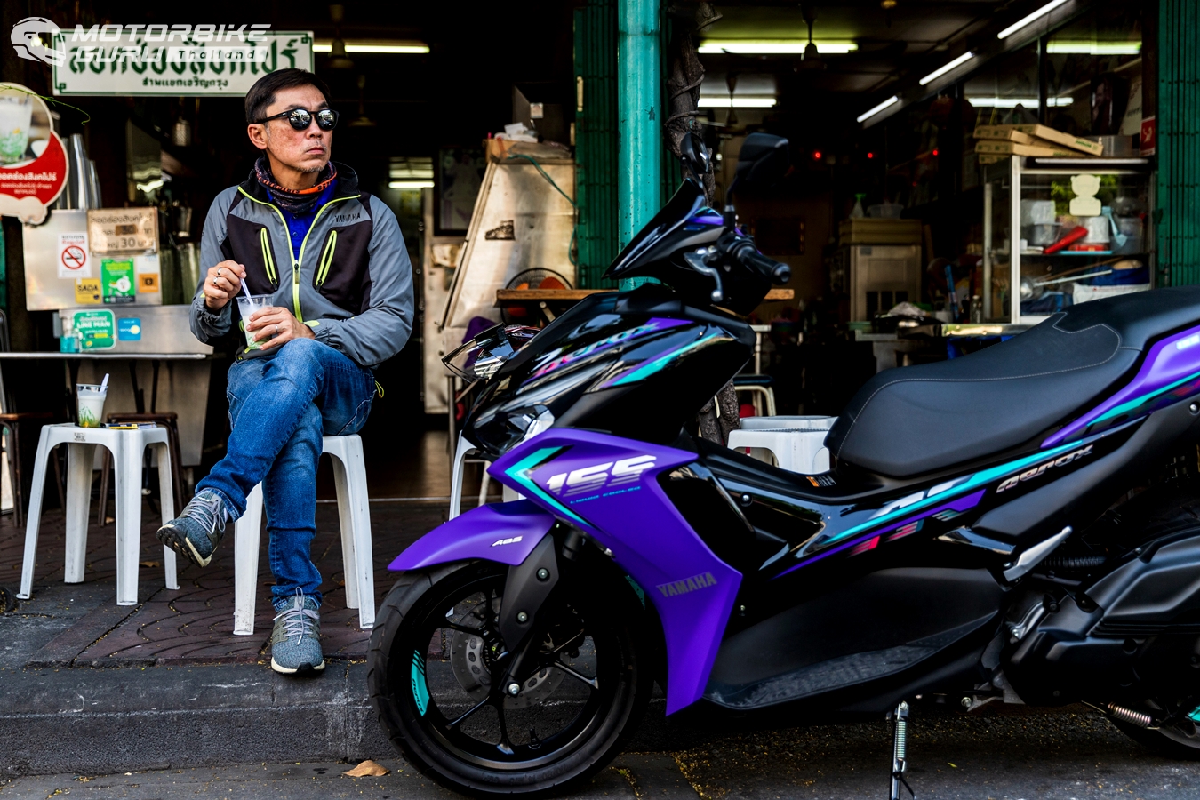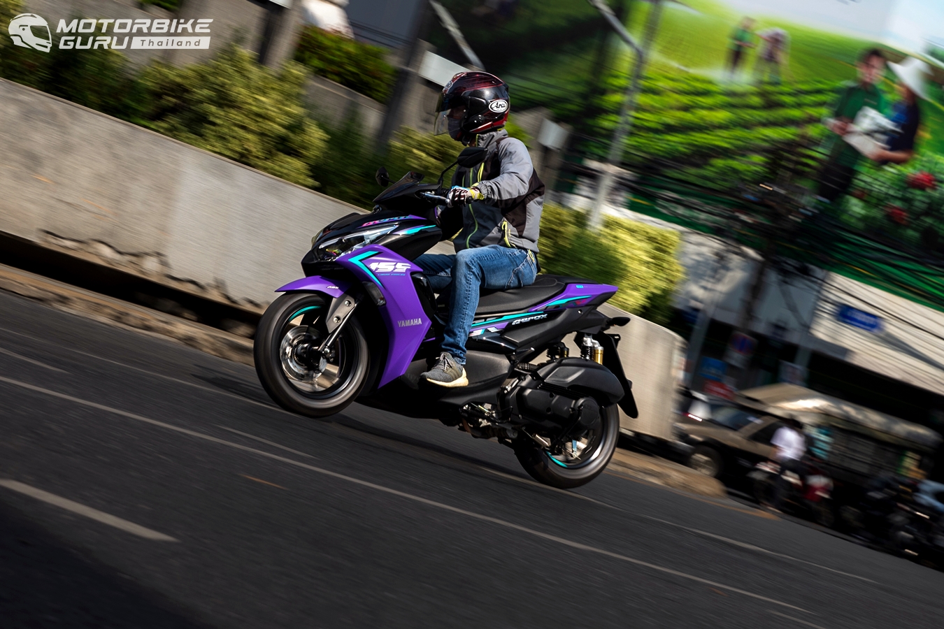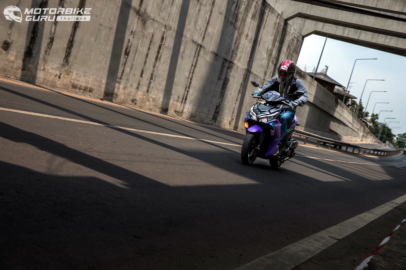 การขี่ New Yamaha AEROX 2023 ครั้งนี้ผู้เขียนใช้เส้นทางในเมืองเป็นหลัก ตัวรถที่ใช้ขี่ครั้งนี้เป็นรุ่น ABS สีม่วงดำ สเปคเครื่องยนต์และฟังก์ชันต่างๆ ยังตอบโจทย์การใช้งานได้ดีเหมือนเดิม เน้นตอบสนองทันใจ ขี่สนุกสไตล์สปอร์ต ผู้เขียนเริ่มสตาร์ทจากถนนแจ้งวัฒนะ ที่ผิวถนนมีการทำซ่อมแซมและปิดบางส่วนไว้เพื่อทำเส้นทางและสถานีรถไฟฟ้า ทำให้ต้องเบาเบรก เบี่ยงหลบหลีกเป็นระยะ แต่ด้วยตัวรถที่มีขนาดคล่องตัว ตอบสนองการเร่งและเบรกได้ทันใจ ประกอบกับความมั่นคงจากการใช้ยางหลังใหญ่ขนาด 140 มม. จึงขี่ไปโดยไม่ต้องพะวงมากนัก
