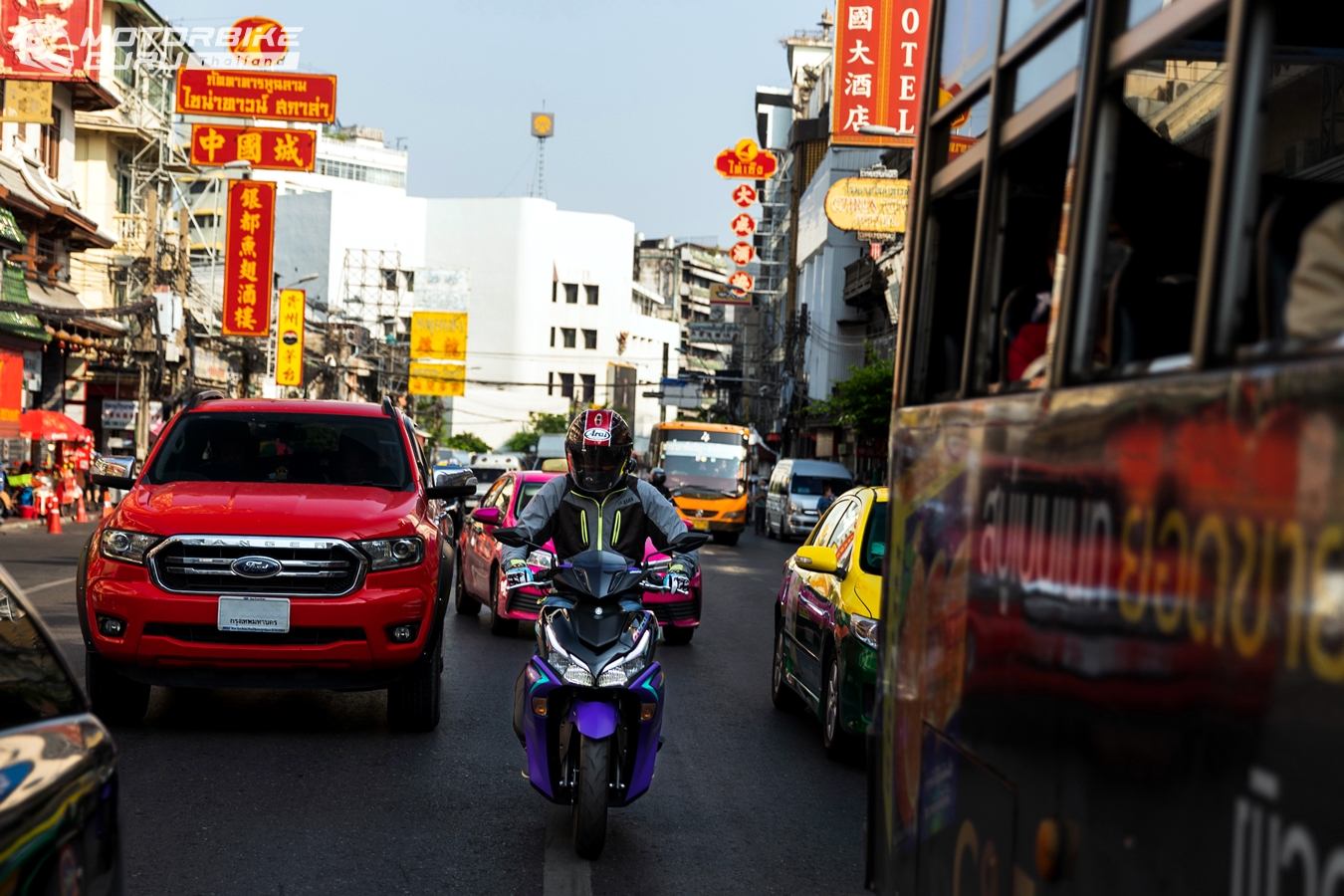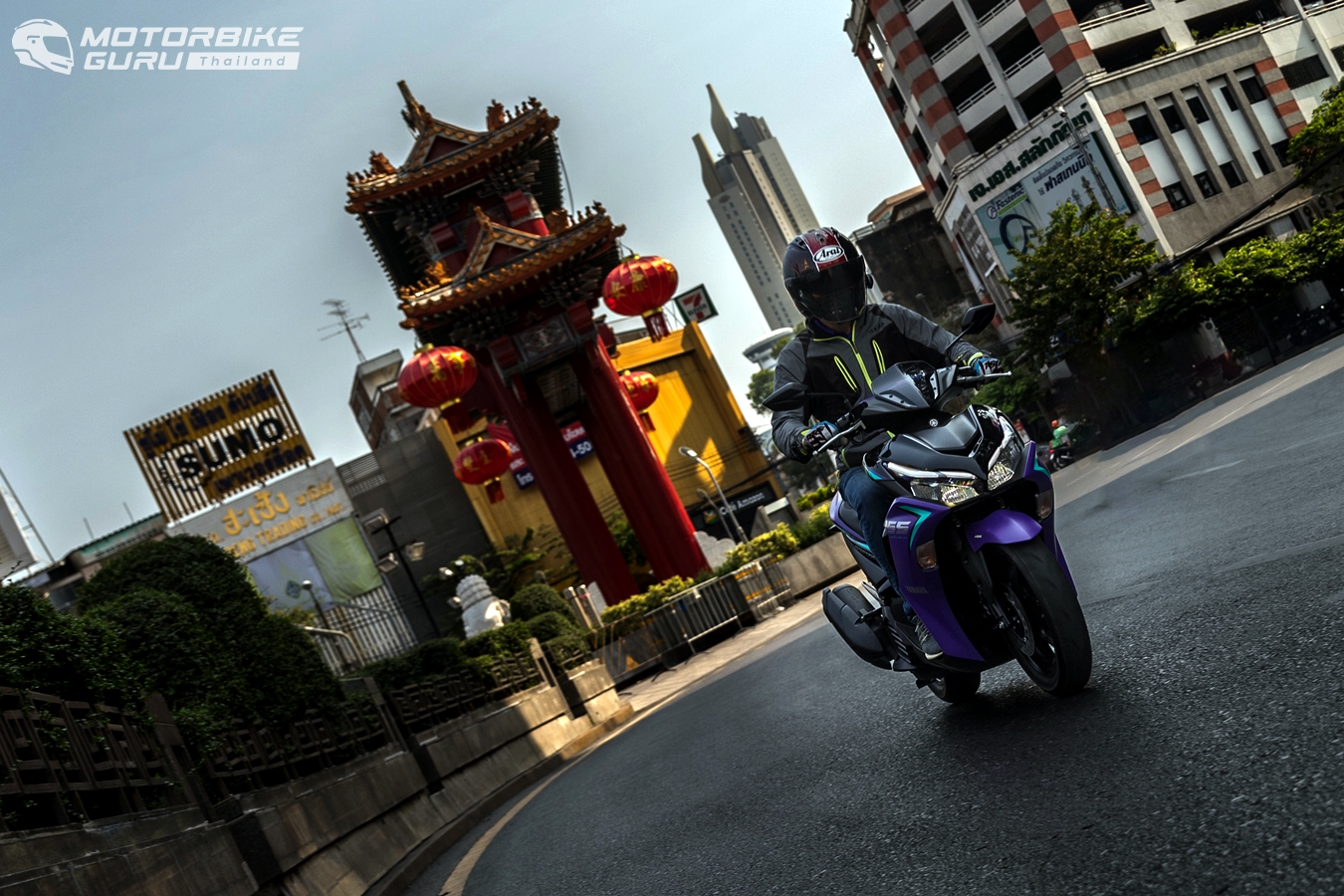 หลักจากพักจนหายร้อนก็ออกเดินทางต่อโดยขี่ไปทางถนนพระราม ๖ ที่ถนนเริ่มกลับมาพลุกพล่านด้วยรถอีกครั้ง รวมทั้งแยกไฟแดงที่ถี่ขึ้นทำให้ต้องเลาะเลี้ยวตามช่องว่างระหว่างรถบ่อยขึ้น ข้อดีที่ชัดเจนคือ ตัวรถที่หนักเพียง 125 กก. ทำให้การควบคุมรถที่ความเร็วต่ำ ตลอดจนการขยับเข็นทำได้ง่ายมากๆ นอกจากนี้ตำแหน่งท่านั่งก็เอื้อต่อการมองช่องทางหรือไลน์ที่จะไปได้สะดวกด้วย เมื่อขี่มาถึงถนนเพชรบุรีตัดใหม่แล้วมุ่งหน้าไปถนนเจริญกรุงผ่านช่วงบางรักตัดเขาซอยเจริญกรุง 40 ตัดซอยเล็กๆ แวะถ่ายรูปสวยๆ กับกำแพงสถานฑูตฝรั่งเศสแล้วไปออกซอย 36 นับเป็นข้อดีของการขี่ ยามาฮ่า แอร็อกซ์ ที่มีความคล่องตัวสูง สามารถขี่ไปจอดแวะไหนในเมืองได้ดั่งใจ