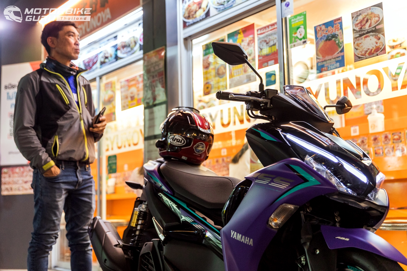 แสงสุดท้ายกำลังลับฟ้าก็เดินทางต่อ จุดหมายต่อไปคือ ซอยธนิยะ ถนนสีลม งานนี้ตั้งใจไปหาความอร่อยสไตล์ญี่ปุ่นเป็นมื้อเย็น แต่ช่วงเย็นแบบนี้การขี่ฝ่ารถติดบนถนนนราธิวาสและสีลมกลายเป็นความท้าทายสุดท้ายที่ต้องผ่านไปให้ได้สวยๆ แน่นอนว่า New Yamaha AEROX 2023 ไม่ทำให้ผิดหวัง สามารถเลาะเลี้ยว เร่ง เบา เบรกได้ดั่งใจไปตลอดทาง มีบ้างที่อยากให้พลังเบรกหนักแน่นกว่านี้ เพราะเวลาเร่งออกตัวยาวๆ แล้วชะลอเบาต้องออกแรงกดก้ามเบรกเยอะอยู่ แต่สำหรับการใช้งานทั่วไปก็นับว่าเพียงพอมากแล้ว