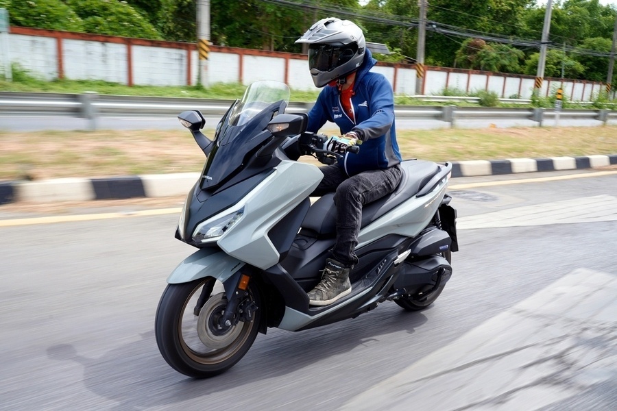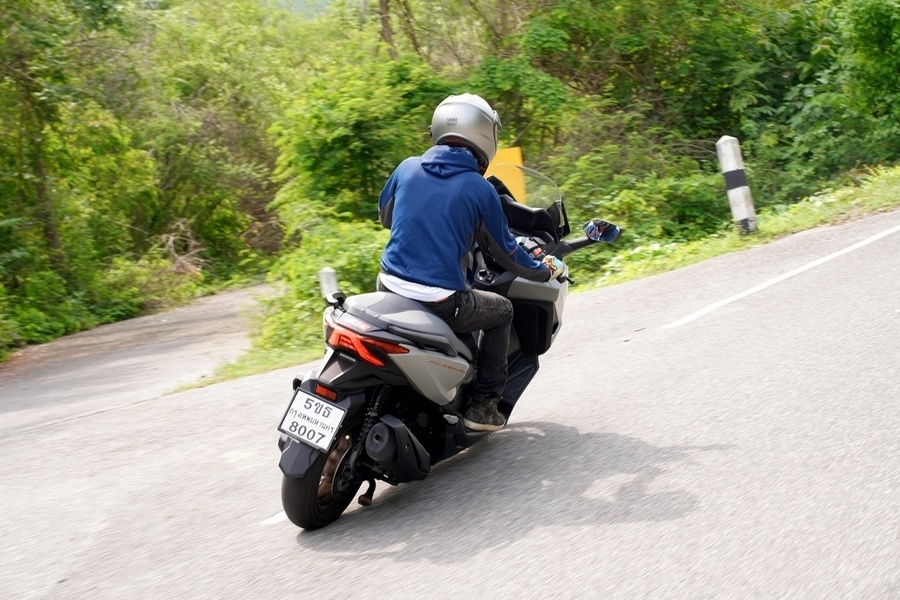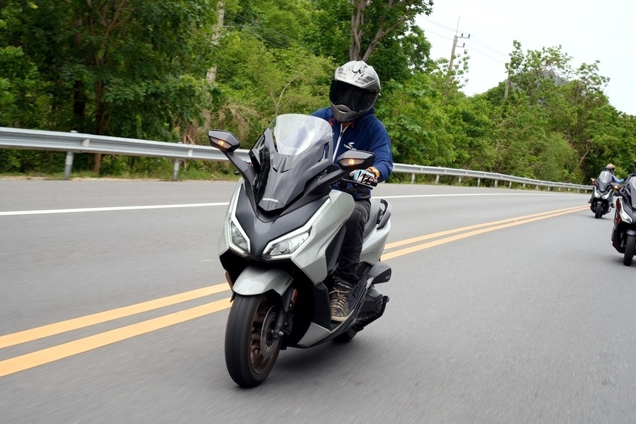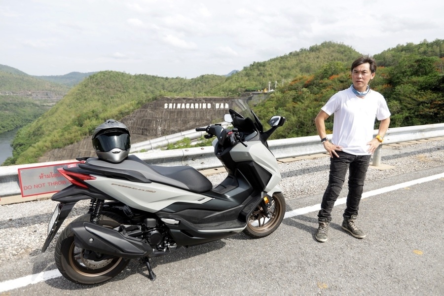 เส้นทางขี่ทดสอบเริ่มจากร้านอาหารไปจุดพัก Amarala Cafe' ระยะทางราว 65 กม. เส้นทางส่วนใหญ่เป็นถนนเลนสวน รอบข้างเป็นธรรมชาติ Forza 350 ใหม่ ให้การขับขี่ง่ายเข้ามือคุ้นชินอย่างรวดเร็ว การเร่งแซงรถช้า และไหลเข้าออกโค้งขึ้นลงเขาให้การควบคุมที่เป็นไปได้ดั่งใจ ช่วงล่างให้ความรู้สึกแน่นกำลังดี ไม่ย้วยโยน จังหวะที่เร่งผ่านพื้นผิวกรวดทราย ระบบแทร็คชันตอบสนองได้ทันทีโดยตัดการทำงานก่อนล้อหลังเกิดอาการสลิปมากจนเกินควบคุม หลังพักดื่มกาแฟก็เดินทางกันต่อไปยังเขื่อนศรีนครินทร์ เพื่อเก็บภาพสวยๆ จนได้เวลาพอสมควรก็ขี่เข้า Leaf Lake KAN ที่พักในทริปนี้ เพื่อสนุกกับกิจกรรมทางน้ำร่วมกัน เสมือนได้ออกทริปขี่่ท่องเที่ยวทางไกล ด้านตัวเลขอัตราสิ้นเปลืองบนหน้าจอฮอนด้า Forza 350 ใหม่ที่เรารีเซ็ตไว้อยู๋ที่ 34 กม./ล. จากระยะทางรวมราว 100 กม. เป็นการขี่ที่ตรงกับความเป็นจริงของการออกทริป เร่งแซงรถช้า ชะลอเบาเบรก ขึ้นลงทางชัน