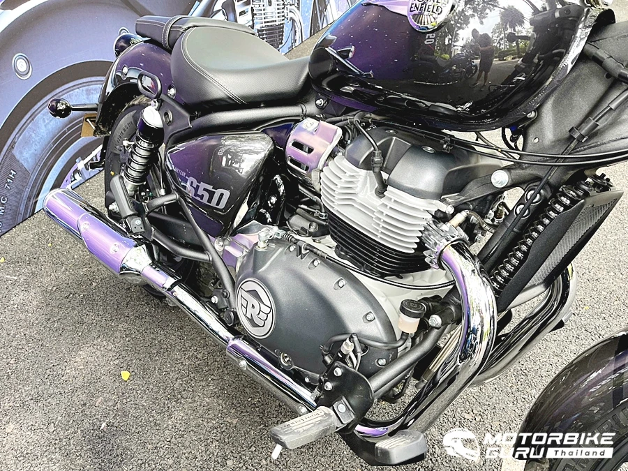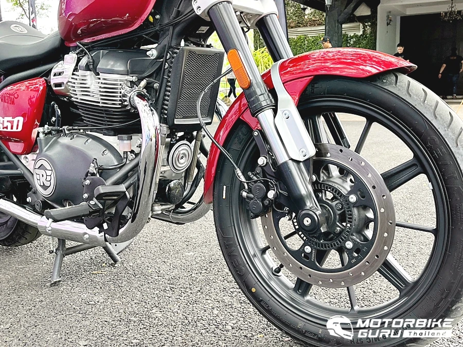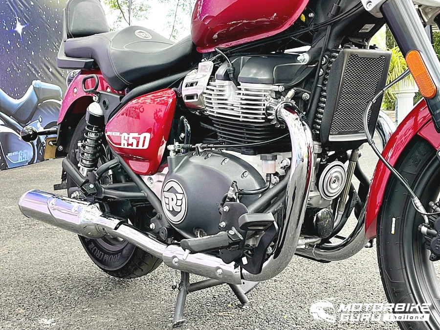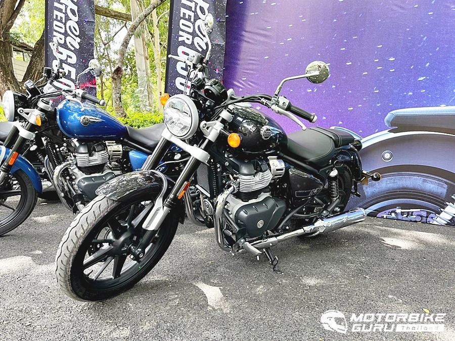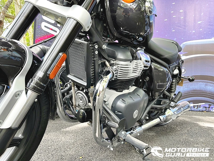 ตัวรถมีจุดศูนย์ถ่วงต่ำเพื่อความมั่นคงในความเร็วสูงพร้อมรับความคล่องตัว ชิ้นส่วนถูกสร้างจากเหล็กที่มีการตีขึ้นรูปที่เหมาะสม มีการหล่อ การกดและการอัดขึ้นรูป แชสซีมีการรวมการยึดหัวกระบอกสูบใหม่เพื่อเพิ่มความแข็งแกร่ง โช้กแบบกลับหัว USD มีระยะยุบ 120 มม. และโช้กหลังระดับพรีเมียมพร้อมพรีโหลด 5 สเต็ปและระยะยุบตัว 101 มม. ช่วยเสริมเฟรมที่ออกแบบมาใหม่ได้อย่างสมบูรณ์แบบ ทำให้ Super Meteor 650 ให้การควบคุมและทรงดี ขี่ง่ายเหมือนรถที่มีน้ำหนักเบาด้วยซ้ำไปครับ