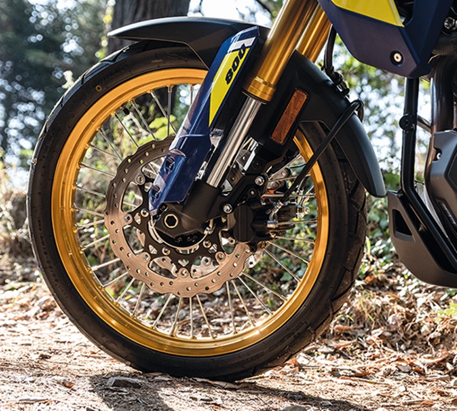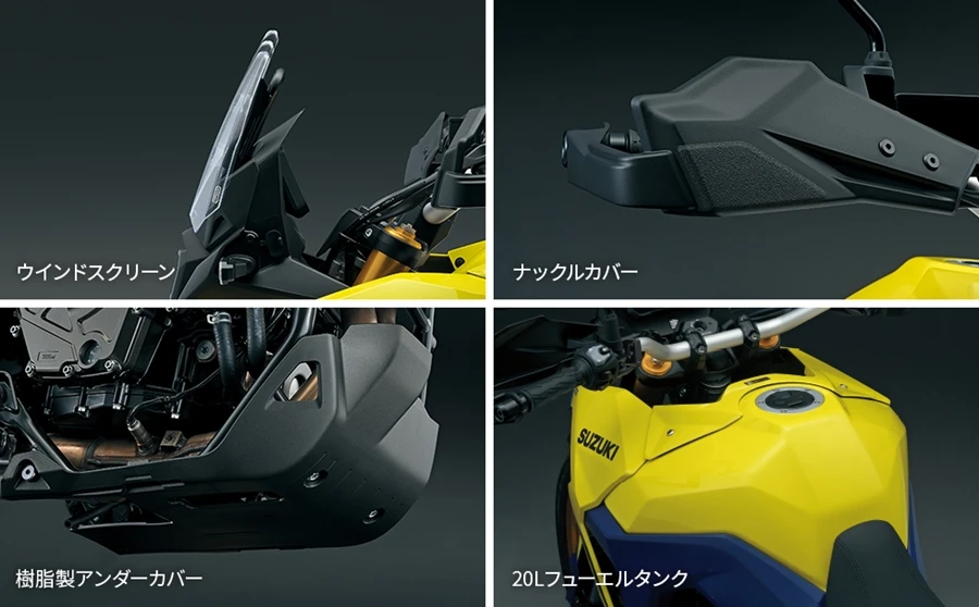 เครื่องยนต์ 2 สูบแถวเรียง 775 ซซ พัฒนาขึ้นใหม่ ปรับสมดุลด้วย "Suzuki Cross Balancer" ลดการสั่นสะเทือนที่เกิดจากเครื่องยนต์ ข้อเหวี่ยง 270° ความรู้สึกขี่สบาย เอาต์พุตราบรื่นและง่ายต่อการขี่ช่วงรอบต่ำ ไปจนถึงช่วงรอบสูง ให้กำลังที่ดีต่อเนื่องในช่วงความเร็วต่ำ จึงสามารถควบคุมคันเร่งได้สบายบนถนนคดเคี้ยวและลูกรัง ขนาดเครื่องยนต์กะทัดรัด สั้น ทำให้ได้ตำแหน่งการขี่ที่เหมาะสม