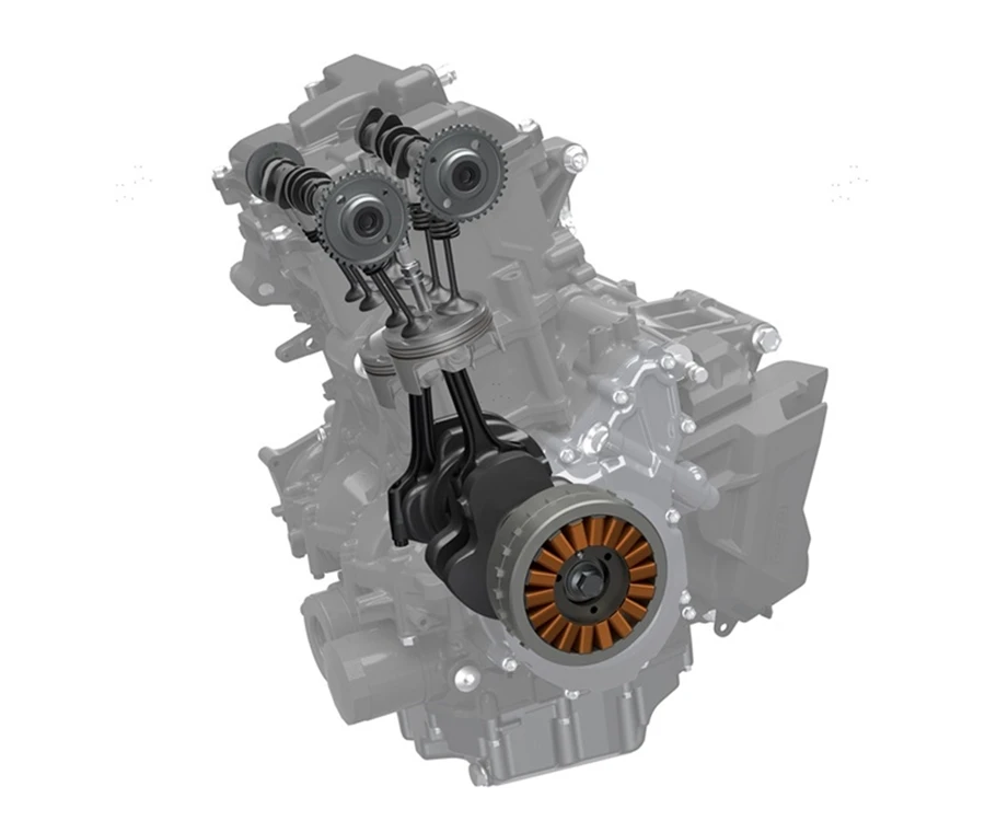 เครื่องยนต์ 2 สูบแถวเรียง 754 ซซ 270 องศา พร้อมวาล์ว Unicam รูปแบบท่อไอดีมีโครงสร้างแบบ downdraft กะทัดรัดและราบรื่น และกลไก Vortex Air Flow Duct ใหม่ ถูกนำมาใช้เพื่อให้การขับเคลื่อนเต็มที่ตลอดช่วงตั้งแต่เปิดลิ้นปีกผีเสื้อจนถึงรอบสูง แรงบิดง่ายต่อการจัดการและให้พลังเร้าใจตั้งแต่ช่วงรอบปกติบนถนนทั่วไป ไปจนถึงรอบสูงแบบเซอร์กิต