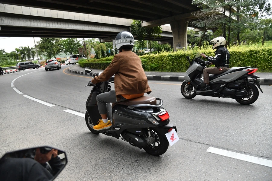 หลังเปิดตัว New Honda Giorno+ คันจริงพร้อมเผยสเปคอย่างเป็นทางการ ไทยฮอนด้าเคลมว่าได้พัฒนาจากเครื่องยนต์ที่ติดตั้งอยู่ในฮอนด้า Lead 125 แต่ให้กำลังดีขึ้น งานนี้เลยจัดให้มีการทดสอบทันที โดยเส้นทางการขี่เน้นการใช้งานในเมือง โดยแบ่งสื่อมวลชนออกเป็นกลุ่มไม่ซ้ำเส้นทางกัน ผู้เขียนตัวแทนจากเพจมอเตอร์ไบค์กูรู และเว็บไซต์เช็คราคา.คอม ได้ขี่ในกลุ่ม D เส้นทางเริ่มต้นจากห้างสรรพสินค้า เซ็นทรัลเวิลด์ ฝ่ากระแสการจราจรพลุกพล่านมุ่งหน้าออกไปทางถนนพระราม 9 เลาะเลี้ยวไปถนนเลียบด่วนรามอินทรา เปิดคันเร่งได้มากขึ้น แม้รถยนต์ยังเยอะแต่ Giorno+ ก็ให้ความคล่องตัวสูงขี่สบาย แม้รู้สึกว่าระยะวางเท้าบนฟลอร์บอร์ดจะสั้นไปหน่อย ทำให้ระยะห่างถึงหัวเข่าค่อนข้างสั้น แต่ก็ยังขี่ได้ไม่ติดขัด ที่สำคัญคือ ทุกครั้งที่ตัวรถหยุดติดสัญญานไฟหรือชะลอ มักได้รับความสนใจจากคนรอบข้างหันมามองตลอด ผู้เขียนกับเพื่อนๆ สื่อมวลชนขี่มาพักกันที่ร้าน John Donut แถวซอยโยธินพัฒนา ซึ่งก็ได้พักเก็บภาพกับ Giorno+ ไปด้วย หลังจิบกาแฟอิ่มโดนัทก็ออกเดินทางต่อไปยังศูนย์การประชุมแห่งชาติสิริกิติ์ ก่อนขี่กลับทางถนนสุขุมวิทกลับเข้าเซ็นทรัลเวิลด์เพื่อสิ้นสุดการขี่ทดสอบแบบซิตี้ไรด์