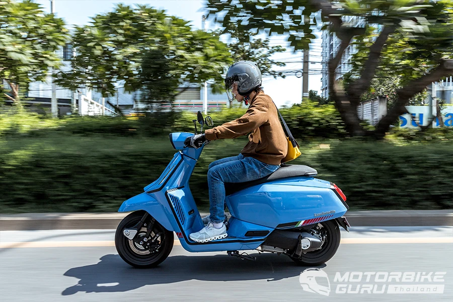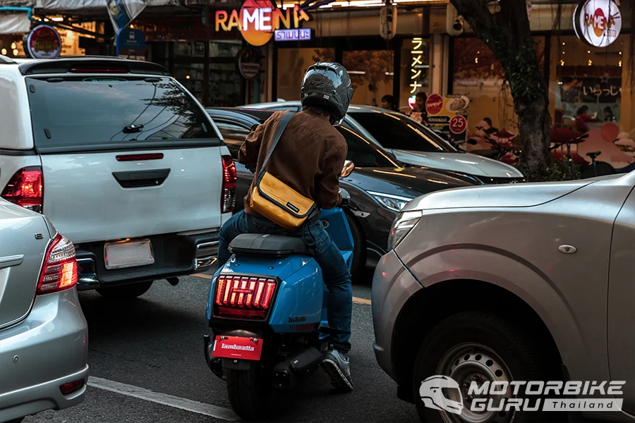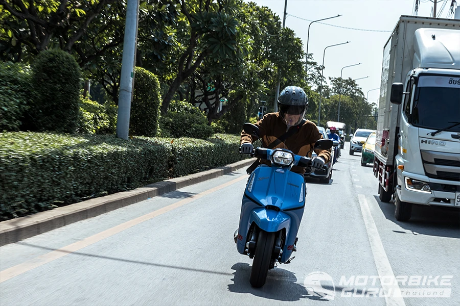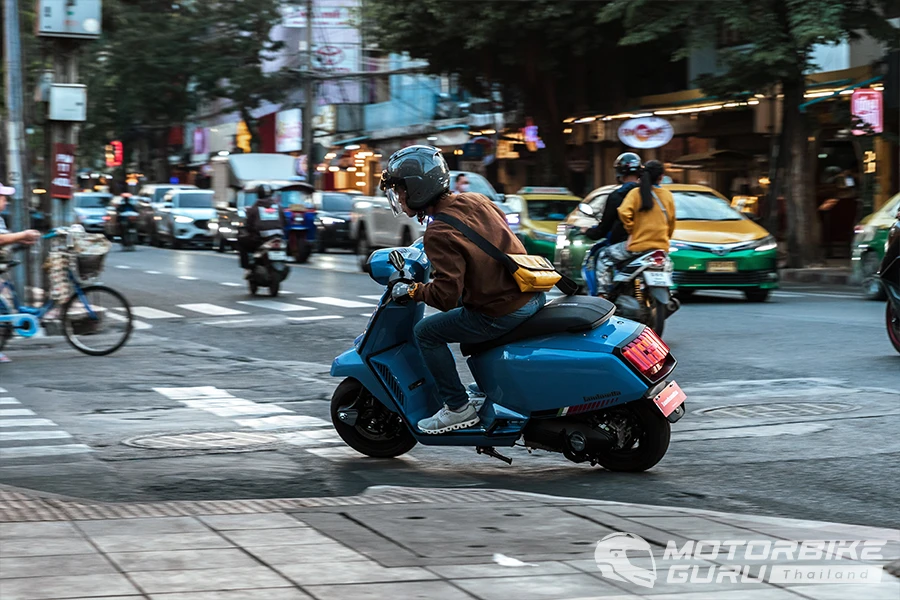 สัมผัสแรกเมื่อคร่อมเบาะที่กว้างและยาวรู้สึกได้ถึงสัมผัสที่นุ่มสบายแม้ด้านหน้าองศาเบาะเหมือนลาดลงจนรู้สึก แต่พอขี่ไปแล้วเบาะแบบนี้ให้ความคล่องตัวในการขยับท่าทางไม่น้อย เส้นทางขี่จากโชว์รูมแลมเบรตต้า แยกกล้วยน้ำไทบนถนนพระราม๔ มุ่งหน้าสู่สามย่าน - ซอย จุฬาลงกรณ์ - ถนนบรรทัดทอง การขี่ทดสอบครั้งนี้ได้เติมน้ำมันไฮพรีเมียม 97 ที่ราคาลิตรละ 47.74 บาท ความรู้สึกช่วงแรกกับการขี่เลาะเลี้ยวฝ่ารถติดบนถนนพระราม๔ ผ่านแยกคลองเตย ลุมพินี จนถึงสามย่าน พบว่าตัวรถให้ความคุ้นชินในการควบคุมได้อย่างรวดเร็ว ทำให้ขี่ได้อย่างความคล่องตัวในการหาช่องว่างซอกแซกไป ตัวรถที่ดูกว้างและหนักกลับให้การขับเคลื่อนที่ฉับไวทุกครั้งที่เปิดคันเร่ง กะระยะได้ง่ายและให้น้ำหนักในการเร่ง ชะลอเบาเบรกได้ง่าย ส่วนหนึ่งเป็นสมดุลที่ดีทั้ง 2 ด้านจากช่วงล่างหน้าแบบ Double Arm-Link ที่ด้านหน้า เบรกก็หายห่วงด้วยดิสก์หน้า-หลังพร้อม ABS ครบเต็มระบบ