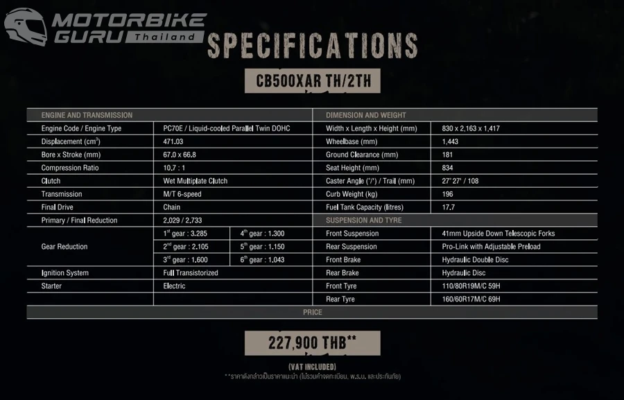 New Honda NX500 บิ๊กไบค์แอดเวนเจอร์รุ่นใหม่ล่าสุดจากฮอนด้ามากับคอนเซปต์ ’The New Adventure Begins’ สู่การเป็นสปอร์ตแอดเวนเจอร์ที่สมบูรณ์แบบมากกว่าเดิมไม่ว่าขี่ทางฝุ่นหรือทางดำ ด้วยการออกมาต่อยอดความสำเร็จของรุ่น CB500X ด้วยดีไซน์ใหม่ทั้งคัน โดยมีน้ำหนักน้อยลงกว่าเดิมถึง 3 กิโลกรัม ทันสมัยและดีขึ้นในหลายจุด เช่น ไฟหน้า LED แบบสปอร์ตพร้อมไฟสูง-ต่ำ กระจายลำแสงได้กว้างรองรับการขี่ทางไกลทุกเส้นทาง, ไฟท้ายแบบใหม่พร้อมสัญญานไฟกะพริบฉุกเฉินตอบสนองอย่างรวดเร็วเมื่อต้องเบรกกระทันหัน, กระจกบังลมหน้าทรงสูง ช่วยลดการปะทะแรงลมขณะขี่ ทั้งยังช่วยลดอาการเหนื่อยล้าเวลาขี่ทางไกลด้วย, เรือนไมล์ใหม่แบบดิจิตอล TFT สี ขนาด 5 นิ้ว แสดงค่าต่างๆ ได้ชัดเจนมากยิ่งขึ้น พร้อมเชื่อมต่อกับระบบ Honda RoadSync เพิ่มความสะดวกสบายทุกการเดินทาง, เครื่องยนต์แมพพิ่งใหม่พร้อมกับระบบ Assist Slipper Clutch ลดการกระชากเมื่อต้องเปลี่ยนเกียร์กระทันหัน, โช้กอัพหน้าแบบหัวกลับขนาดใหญ่ 41 มม. ช่วยลดแรงกระแทกและอาการสะเทือนของตัวรถ ขี่ได้สบายขึ้นแม้ต้องมีโหลดสัมภาระติดรถตอนออกทริป และระบบเบรกแบบดูอัลดิสก์ที่ตอบสนองการหยุดรถได้อย่างรวดเร็วและแม่นยำ และมั่นใจกับระบบเบรก ABS