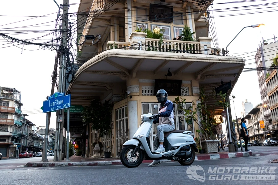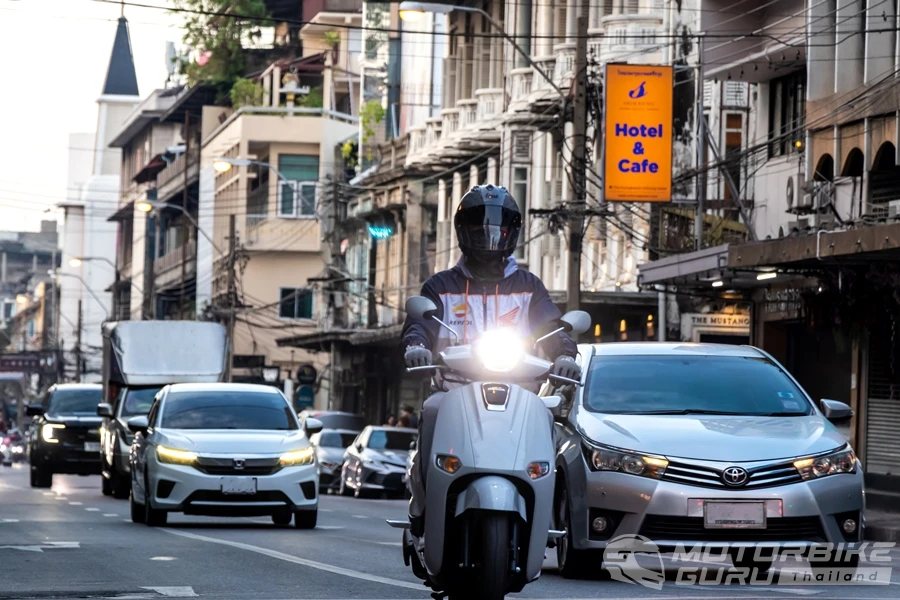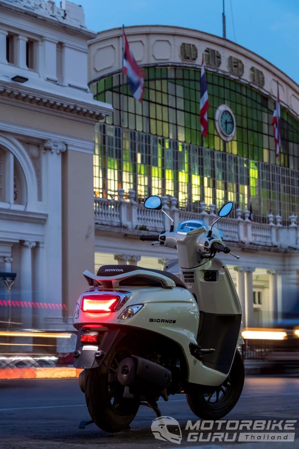 เริ่มบิดสตาร์ทกันจาก นอร์ธปาร์ค หลักสี่ ออกสู่ถนนวิภาวดีฯ มุ่งหน้าแยกราชประสงค์ ผ่านการจราจรที่คับคั่งย่านประตูน้ำ ราชประสงค์ สีลม ไปจอดพักถ่ายรูปย่านบางรัก-เจริญกรุง บันทึกภาพเก๋ๆ กับสีสันของ Photograffiti บนกำแพง กับตัวรถที่ดูเข้ากัน หลังจากนั้นก็ขี่ซอกแซกไปตามถนนพระราม 4 และตรอกมากมายที่มีตึกเก่าร้านดีแฝงตัวอยู่ในย่านถนนไมตรีจิตต์ ตัวรถ ฮอนด้า Giorno+ ให้ขี่ง่ายให้ความคล่องตัวมากๆ ด้วยน้ำหนักที่เบาทำให้การคอนโทรลตัวรถเวลาขี่ในเมืองทำได้ดี นอกจากนี้เมื่อต้องชะลอเบาเบรกจนหยุดก็ทำได้ดีเช่นกัน เมื่อขี่เพลินจนเริ่มหมดแสงตัวเรือนไมล์ก็โดดเด่นมากขึ้นเรื่อยๆ ด้วยแสงสว่างคมชัดอ่านง่าย ระหว่างการเดินทางก็ไม่ต้องแบกของติดตัวให้เกะกะมากมายเพราะที่เก็บของใต้เบาะกว้างและใส่ของได้เยอะ จนแสงสุดท้ายของวัยหมดไปจึงมาจอดพักเก็บภาพยามค่ำกับ ฮอนด้า Giorno+ ด้วยความรู้สึกประทับใจในด้านสมรรถนะ กำลัง ความคล่องตัว อรรถประโยชน์ ความประหยัด และรูปลักษณ์ที่คลาสสิคร่วมสมัย