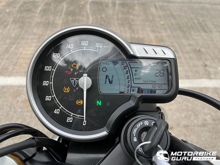 มาพร้อมความทันสมัยมาตรวัดความเร็วอนาล็อก พร้อมจอ LCD มัลติฟังก์ชันในตัว ที่ใช้งานง่ายเพียงปลายนิ้วโป้งซ้ายกดปุ่ม " i " เพื่อเลือกการแสดงหน้าจอต่าง ๆ เช่น ทริป A/B, อัตราสิ้นเปลืองรวม/เฉลี่ย, ระยะทางรวม, สั่งเปิด-ปิดระบบควบคุมรถ พร้อมแสดงความเร็วแบบเข็ม ไฟหน้าทรงกลม ถังน้ำมันดีไซน์แบบรุ่นใหญ่ ๆ เครื่องยนต์ระบบายความร้อนด้วยน้ำ แต่ก็ไม่ทิ้งเอกลักษณ์ "ครีบระบายอากาศ" และยังสามเหลี่ยมด้านข้างเครื่องยนต์พร้อมท่อไอเสียที่มองแล้วรู้ทันที่ว่าเป็นรถไทรอัมพ์ โดยรวมแล้วรูปลักษณ์ให้ความคลาสสิกจาก DNA Roadster แบบโมเดิร์นคลาสสิกและแบบ Triumph Scrambler ที่ไม่เหมือนใครของ Triumph