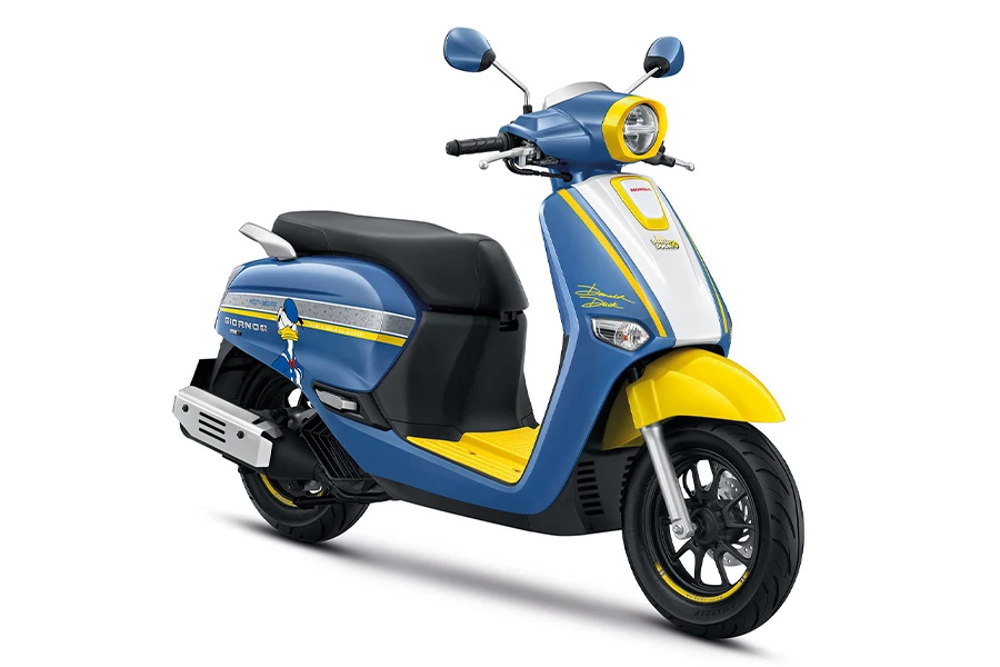 Honda Giorno+ Donald Duck Special Edition มาพร้อมแนวคิด “แฟชั่นฤดูความดั๊ก” โดยนำคาแรกเตอร์ยอดฮิตตลอดกาลอย่าง “โดนัลด์ ดั๊ก” มานำเสนอความสนุกสนาน และความน่ารักสุดป่วน ผ่านลวดลายกราฟิกลงบน Honda Giorno+ อย่างลงตัว โดดเด่นด้วยสีน้ำเงิน-เหลือง ที่เป็นคู่สีของโดนัลด์ ดั๊ก ลงตัวกับชุดครอบไฟหน้าสีเหลือง เพิ่มความโดดเด่นด้วย 3D Emblem และลายเซ็น ฉลองครบรอบ 90 ปี Donald Duck บ่งบอกความเป็นตำนานของคอลเลกชันนี้ที่ไม่มีใครเหมือน ผลิตและวางจำหน่ายเพียง 2,000 คันเท่านั้น