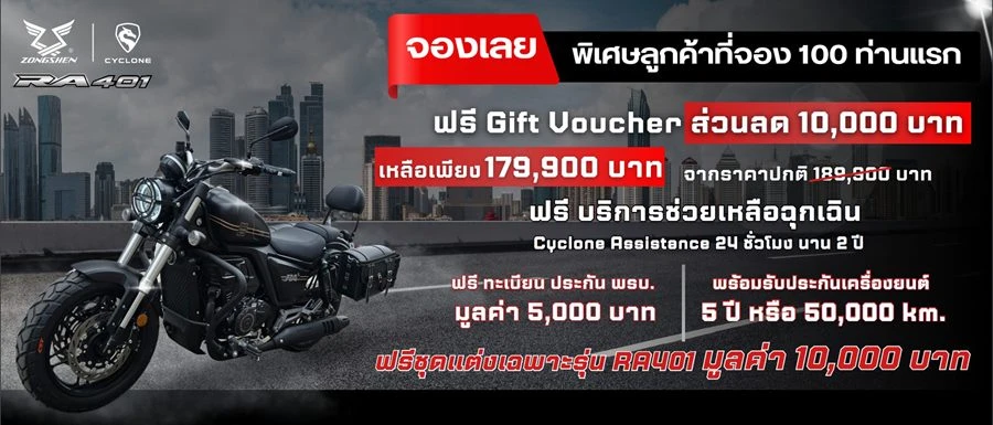 และพลาดไม่ได้กับแคมเปญสุดพิเศษช่วงเปิดตัว สำหรับลูกค้า 100 ท่านแรกที่จอง CYCLONE RA401 จะได้รับ Gift Voucher มูลค่า 10,000 บาท และฟรีชุดแต่ง มูลค่า 10,000 บาท