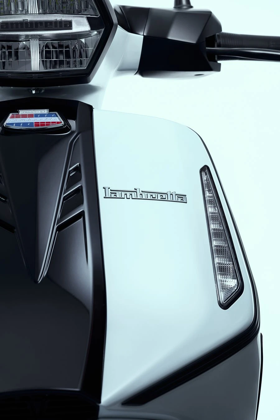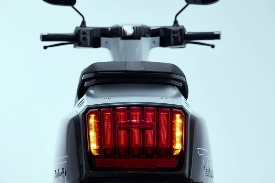 อีกหนึ่งเอกลักษณ์ที่ถ่ายทอดมาจากรุ่นยอดฮิตของแลมเบรตต้า ออกแบบมาให้แฝงโลโก้ไว้ภายใน บ่งบอกตัวตนไว้ได้อย่างชัดเจน และส่วนของไฟท้ายที่บึกบึนดูแข็งแกร่งแตกต่างไม่ซ้ำใคร ให้ความพรีเมียมเหนือระดับ กับดีไซน์ในรูปทรงคริสตัล 7 แท่ง ที่เพิ่มเลเยอร์ในการซ้อนโคมด้านนอกอีกชั้น มาพร้อมกับ ระบบ IFS (Integrate-Function Signals) ที่ออกแบบให้ทั้ง ไฟเลี้ยว/ไฟฉุกเฉิน/ไฟเบรก build-in อยู่ภายใต้โคมไฟท้ายเดียวกัน มาพร้อมกับการใช้งานในระบบ Smart Key ที่เพียงแค่พกพา Smart Key ใกล้ตัวรถ ก็สามารถบิดสตาร์ทได้ทันที อีกทั้งยังให้ความปลอดภัยที่มากกว่า ด้วยดิสก์เบรกทั้งด้านหน้า และด้านหลัง ทำงานพร้อมกับระบบเบรกแบบ Dual-channel ABS และเสริมฟังก์ชันที่ตอบโจทย์ไลฟ์สไตล์ในปัจจุบัน ด้วย USB Charger (Type-C) ที่ซ่อนอยู่บริเวณช่องซ้ายมือ สำหรับเสียบชาร์จแบตเตอรี่อุปกรณ์สื่อสารได้