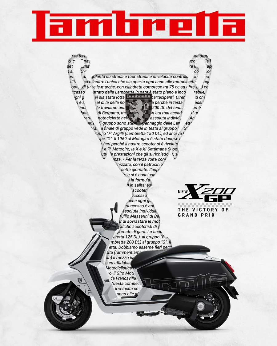 LAMBRETTA (แลมเบรตต้า) แบรนด์รถสกู๊ตเตอร์ตำนานกว่า 77 ปีจากอิตาลี เปิดตัวรถรุ่นใหม่ LAMBRETTA X200 GP ด้วยการนำรหัส GP กลับมาใช้ในโมเดล X-Series ผสมผสานกลิ่นอายและจิตวิญญาณของตำนานสนามแข่งในอดีตจากรุ่น LAMBRETTA GP/DL ในปี 1969 ที่สร้างชื่อเสียงให้กับ LAMBRETTA ในฐานะสกู๊ตเตอร์ที่ไม่ใช่เพียงแค่ยานพาหนะ แต่ยังเป็นตัวแทนแห่งความกล้าหาญและจิตวิญญาณแห่งการแข่งขัน!