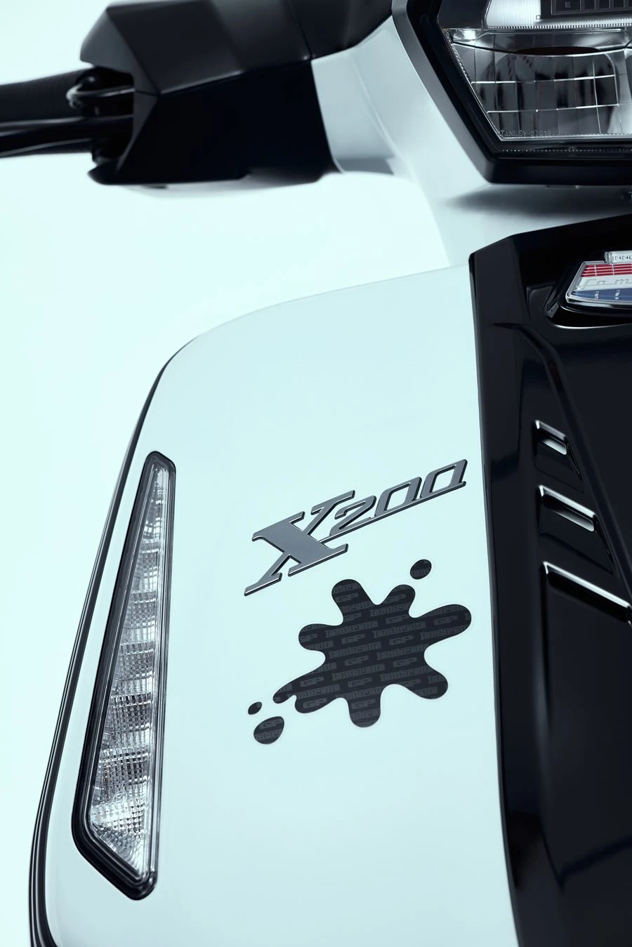 นอกจากนี้ X200 GP ยังผสานความคลาสสิกจากปี 1969 เข้ากับดีไซน์สุดล้ำในปัจจุบัน ด้วยบังโคลนหน้าแบบ Fix Fender ที่ยังคงเป็นอีกหนึ่งเอกลักษณ์ที่สื่อถึงความทนทานและดีไซน์ที่แข็งแกร่งของรุ่น GP ดั้งเดิม ทุกเส้นสายของ X200 GP ถูกออกแบบมาเพื่อสื่อถึงความสปอร์ตแบบไร้ขีดจำกัด แต่ยังคงรักษาความคลาสสิกในแบบฉบับที่แลมเบรตต้าเป็นมา และแน่นอนว่า การมาด้วยรหัส GP ต่อท้ายเช่นนี้ ย่อมต้องมีสัญลักษณ์อันเป็น ICONIC จากรุ่นตำนาน ที่สืบสานมาสู่รุ่นล่าสุดอย่างแน่นอน! นั่นก็คือ สัญลักษณ์รูปหยดหมึก หรือ Ink Splat ที่ถูกประทับลงบนบริเวณด้านหน้ารถ X200 GP คันนี้ นับเป็นเอกลักษณ์ที่สะท้อนถึงความคลาสสิกที่ยังคงสดใหม่ในใจของชาวแลมเบรตติสต้าเสมอมา