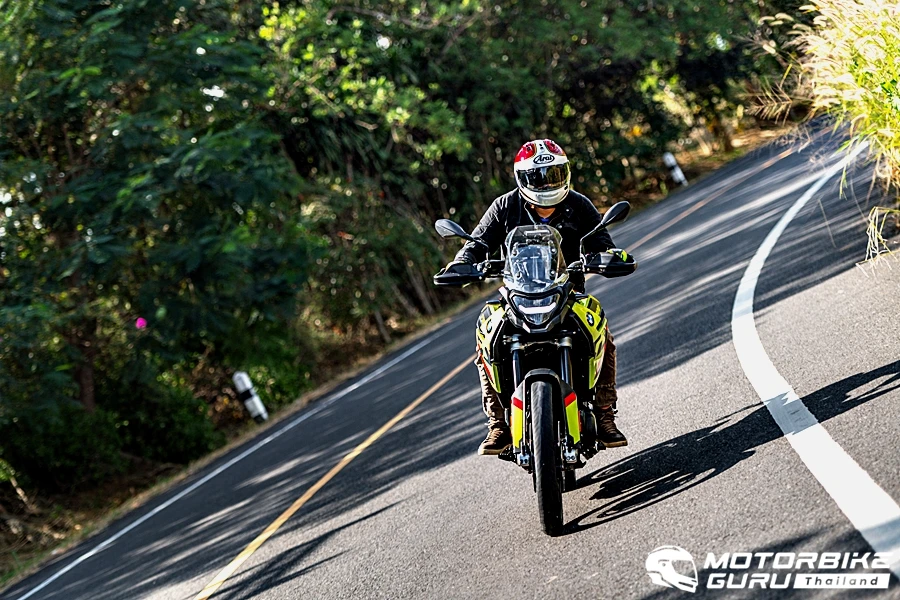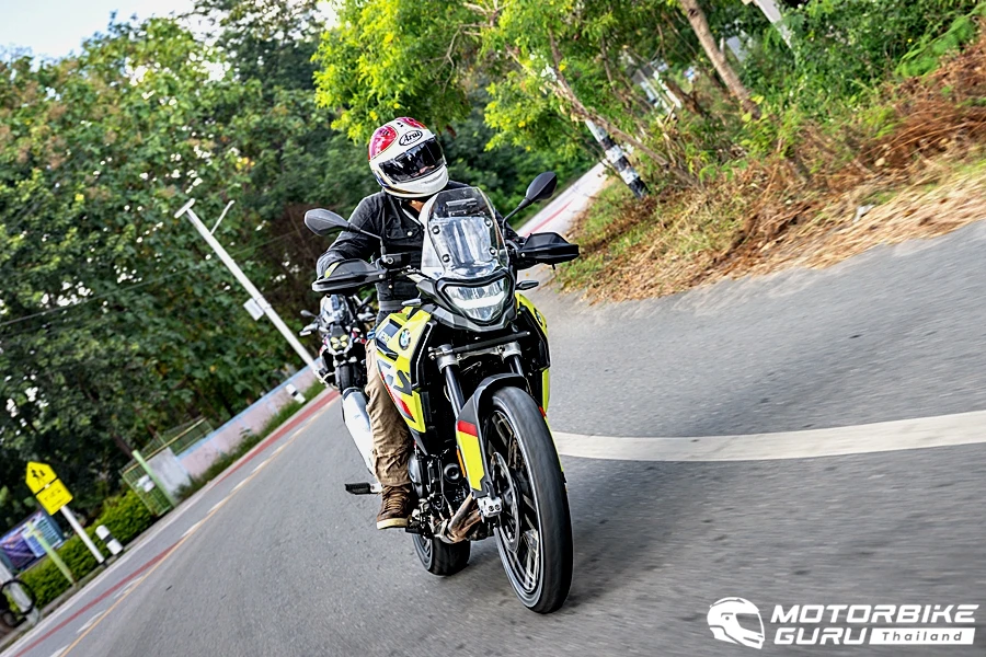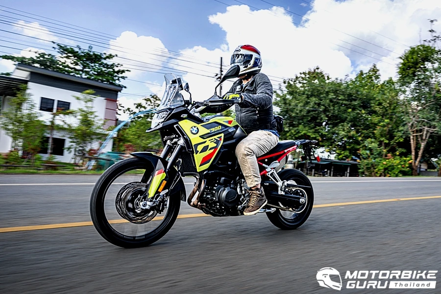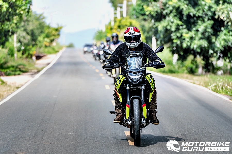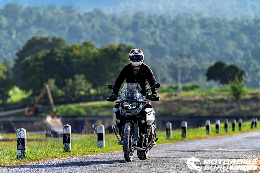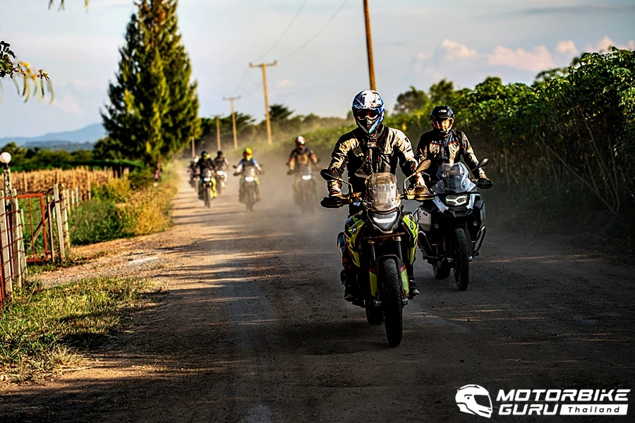มาถึงช่วงทางฝุ่นหรืออฟโร้ดเบา ๆ สลับเป็นรถเป็น F 900 GS Adventure แต่ก่อนเข้าทางฝุ่นขับผ่านเส้นทางถนนปกตินั้น รุ่นนี้ถือว่าขับขี่สบายกว่าและให้ความนุ่มนวลและอาการสั่นของเครื่องยนต์เบาลงกว่า นับว่าหากขับขี่บนทางดำทั่วไปหรือจะแนวทัวร์ริ่งคันนี้ตอบโจทย์มาก ๆ ครับ ได้ทั้งความเบา นุ่มนวล ขี่สบาย และชิวบังลมที่กั้นลมปะทะลำตัวหรือหมวกได้ดีเกินคาด ให้ความคล่องตัวพริ้วในโค้งได้ดี แม้ถังน้ำมันจะใหญ่ขึ้นก็ตาม
