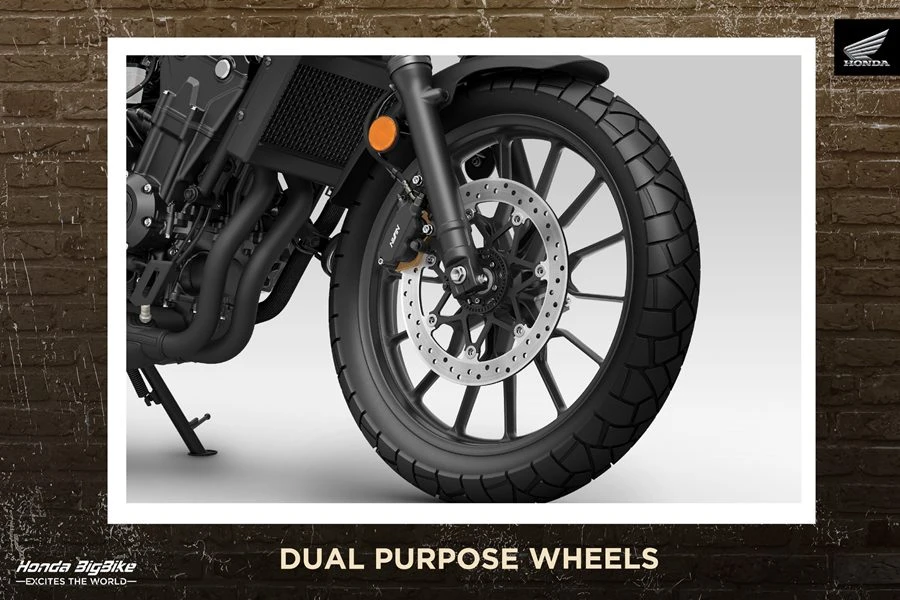 ล้อหน้าขนาด 19 นิ้ว ล้อหลัง 17 นิ้ว พร้อมยาง Dual Purpose ท้าทายได้ทั้งทางดำและทางฝุ่น ควบคุมมั่นใจด้วยแฮนเดิลบาร์ยกสูง เบาะ Scrambler นั่งสบายในทุกเส้นทางถังน้ำมันขนาด 12 ลิตรดีไซน์เฉพาะ พร้อม Rubber Pad เพิ่มการยึดเกาะ พร้อมลุยทุกเส้นทางผจญภัย