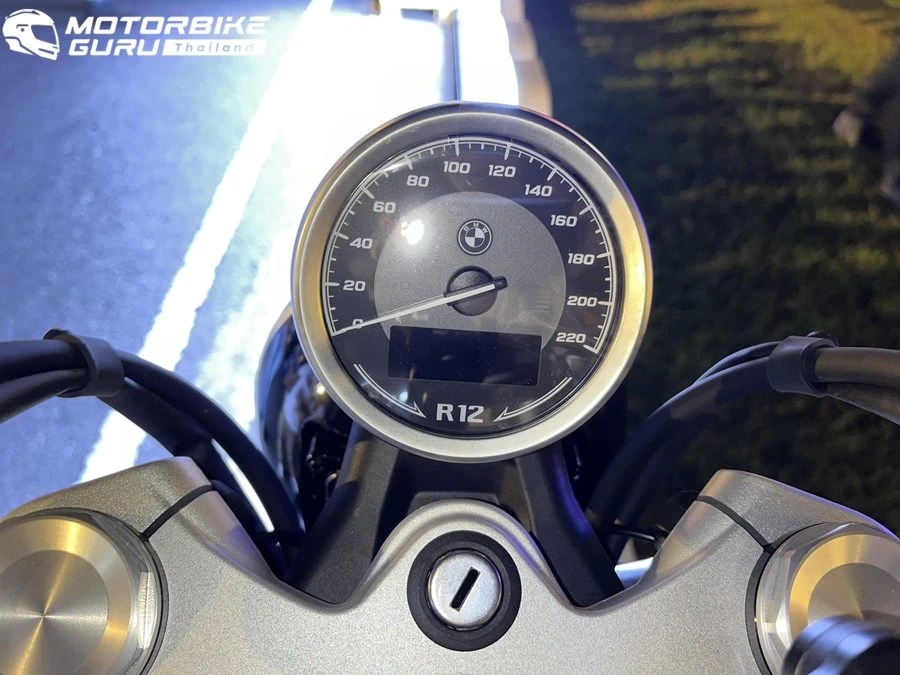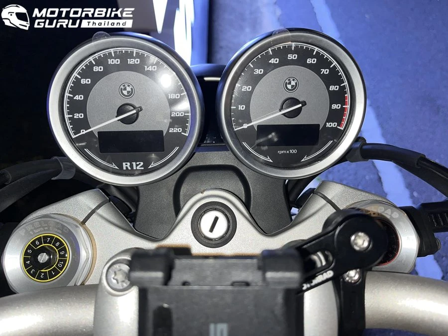 ส่วนด้านหน้ารถ R 12 nineT มาพร้อมกับหน้าปัดทรงกลมคู่แบบอนาล็อก พอร์ต USB-C สำหรับชาร์จอุปกรณ์ และช่องเสียบไฟ 12V ขณะที่ R 12 รักษาแนวคิดของความเรียบง่ายด้วยหน้าปัดเดี่ยวสำหรับบอกความเร็ว