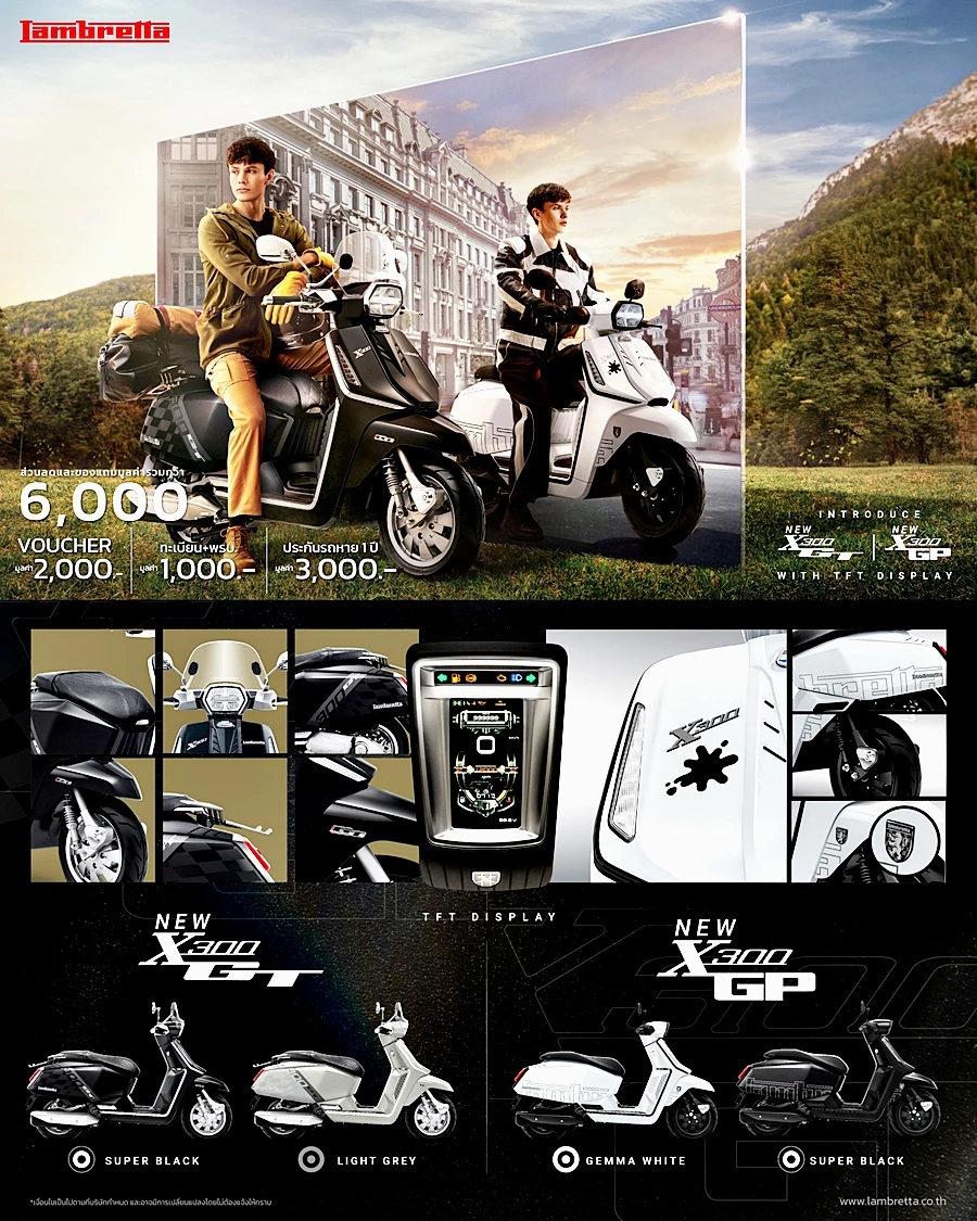 LAMBRETTA ได้เปิดตัวสกู๊ตเตอร์รุ่นใหม่ล่าสุดพร้อมกันถึงสองรุ่น ได้แก่ X300 GP และ X300 GT ที่ยังคงสืบสานคุณค่าและจิตวิญญาณของแบรนด์ พร้อมเติมเต็มเทคโนโลยีและดีไซน์ที่ทันสมัยเพื่อตอบสนองความต้องการของผู้ขับขี่ในยุคปัจจุบัน กับฟังก์ชันที่อัพเกรดมาใหม่ ในหน้าจอแสดงผล แบบ TFT สีสันคมชัด บอกข้อมูลครบครัน อีกทั้งยังสามารถเชื่อมต่อ Bluetooth กับสมาร์ทโฟนได้