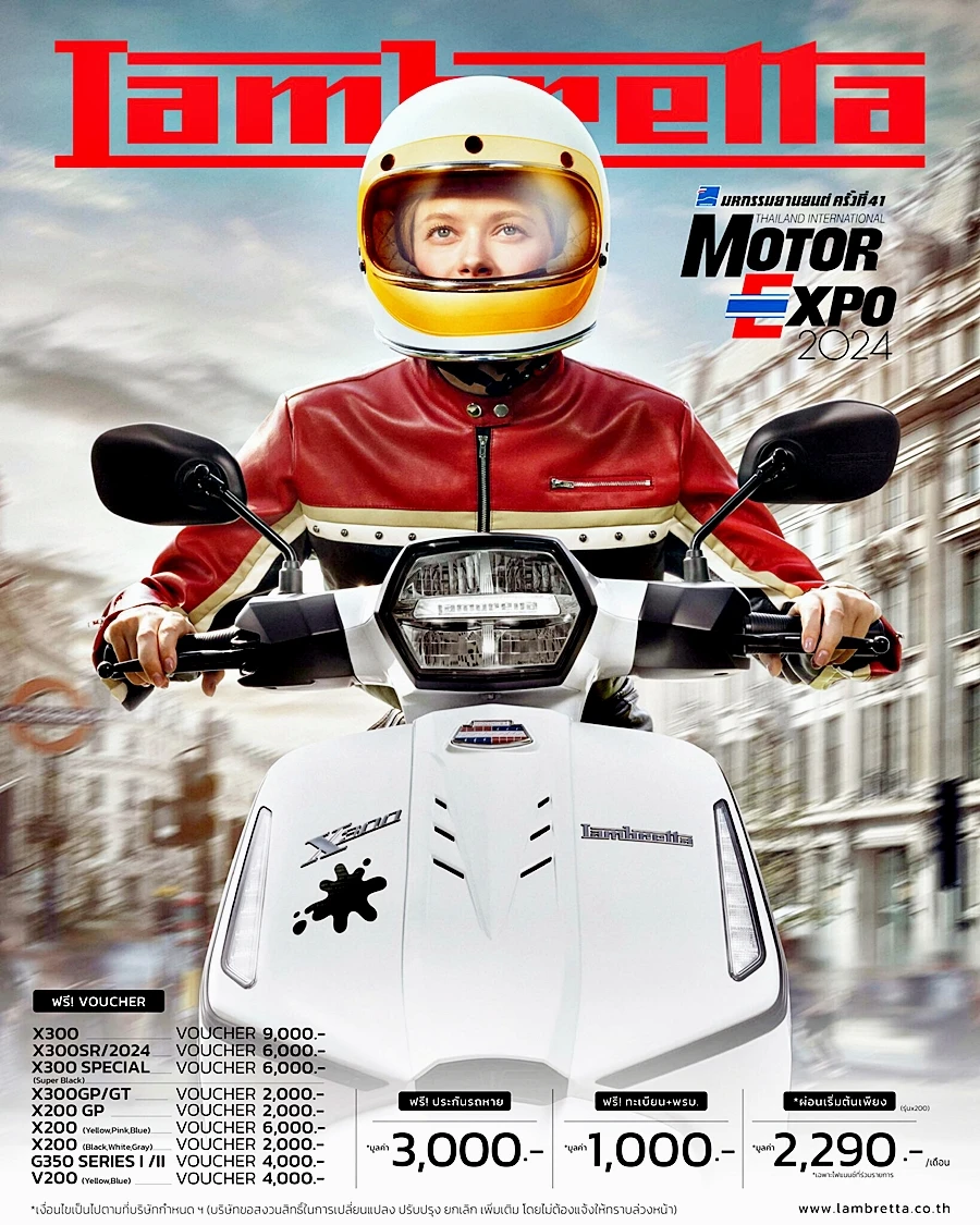 พร้อมแล้วที่จะให้คุณได้สัมผัสกับ DNA ตำนานรุ่นล่าสุด X300 GP และ X300 GT พร้อมทั้งไฮไลท์พิเศษจาก LAMBRETTA ได้ที่บูธ รหัส G02 ในงาน MOTOR EXPO 2024 ที่จัดขึ้นตั้งแต่วันนี้ - 10 ธันวาคม 2567 ณ อาคารชาเลนเจอร์ ฮอลล์ 3 อิมแพ็ค เมืองทองธานี