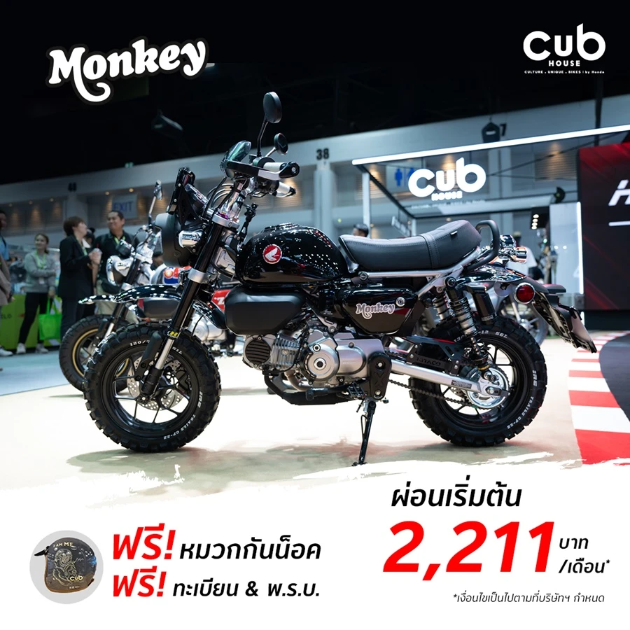 CUB House นำมาอวดโฉม 2 รุ่น สุดคุ้มสำหรับสายไลฟสไตล์ เริ่มจาก New Honda Monkey 2024 ที่มาพร้อมโปรโมชัน ฟรีหมวกกันน็อก ทะเบียน และ พ.ร.บ. ราคา 99,700 บาท ผ่อนเริ่มต้น 2,211 บาทต่อเดือน หรือสำหรับสายซนที่ชื่นชอบสไตล์เรโทรอย่าง Honda Monkey Retro Apes Custom Edition ที่เปิดราคาที่ 109,900 บาท พร้อมรับฟรีหมวกกันน็อกสุดเท่ โดยผ่อนเริ่มต้นเพียง 2,494 บาทต่อเดือน