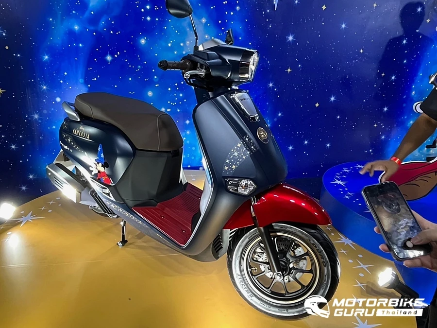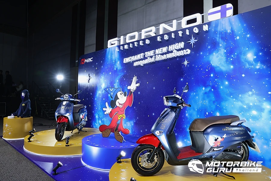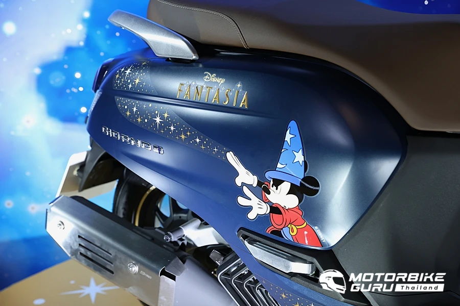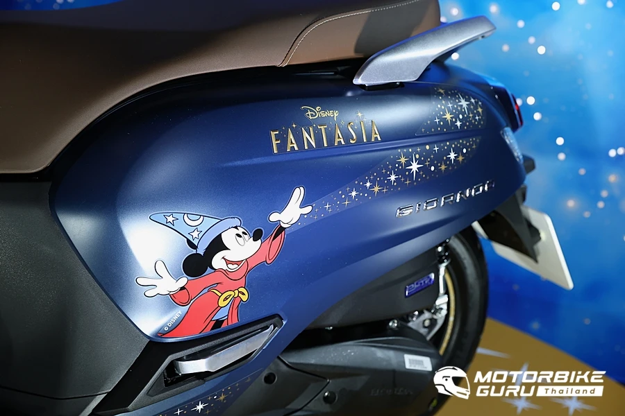 ตามด้วย ‘Honda Giorno+ Disney Fantasia 85 Years Limited Edition’ มาพร้อมคอนเซปต์ ‘ENCHANT THE NEW HIGH เสกทุกสไตล์ ให้กลายเป็นดาว’ โดยนำเอาแอนิเมชันระดับตำนานอย่าง ‘Disney Fantasia’ ลวดลายจอมเวทย์มิกกี้เม้าส์มาคอลแลปกับมอเตอร์ไซค์สไตล์ High Fashion อย่าง Honda Giorno+ โดยสร้างปรากฏการณ์สุด Magical พาสไตล์ไปเหนือจินตนาการด้วยเฉดสีน้ำเงินเข้มแซมแดง ผสานความลงตัวด้วยสติกเกอร์ Reach for the stars โดดเด่นท่ามกลางลวดลายดวงดาวที่เรืองแสงได้ในยามค่ำคืน เพิ่มความพิเศษด้วย 3D Emblem สีทองและโลโก้ฉลองครบรอบ 85 ปี แอนิเมชันในตำนาน พร้อมระบุ Serial Number เสริมความลิมิเต็ดให้กับเหล่าสาวก Disney อีกด้วย ที่สำคัญเสริมภาพลักษณ์ความเท่ สะดุดตาไปอีกขั้นด้วยครอบท่อไอเสียสแตนเลส และสติกเกอร์วงล้อ H2C