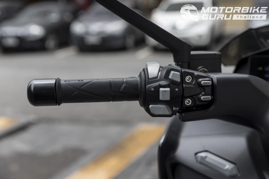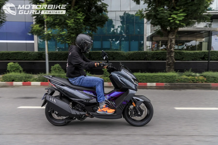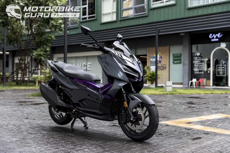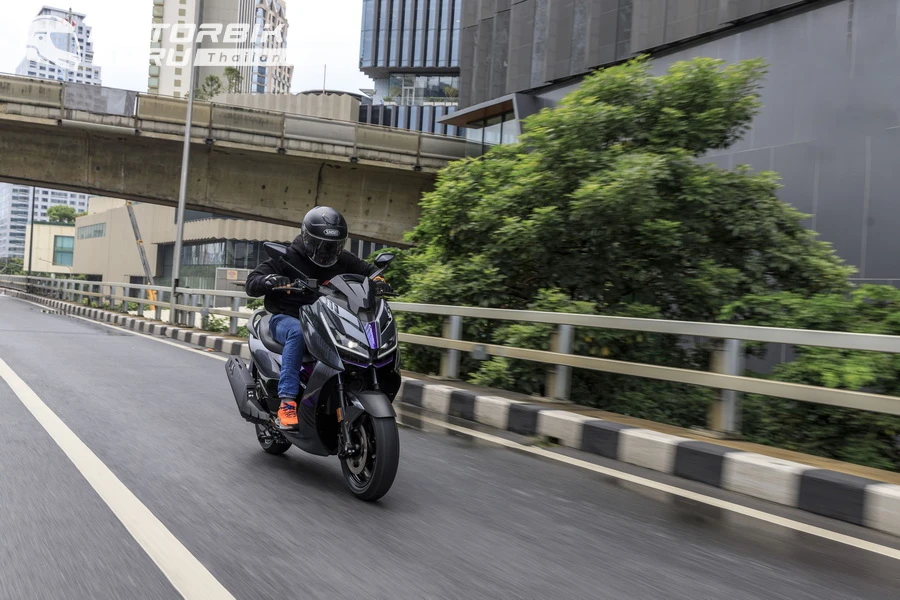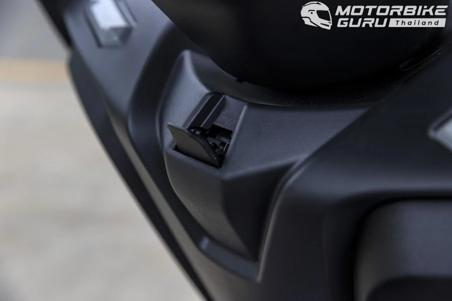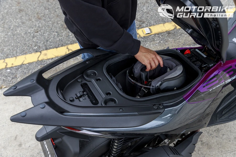 เพื่อสัมผัสถึงพลังเครื่องยนต์ขนาด 368 ซีซี รุ่นใหม่ล่าสุด ให้พละกำลังแบบ High Compression รอบต้นแรงทันใจ ความเร็วไหลไปได้เรื่อยๆ ไม่ต่ำกว่า 160 กม./ชม. ในโหมด Sport ไปได้อย่างมั่นใจในทุกความเร็ว จนมาจอดเก็บภาพอีกครั้งเพื่อบันทึกรายละเอียดต่างๆ ของตัวรถ แต่พบว่าตัวรถเข็นขยับจอดง่ายเพราะน้ำหนักรถเพียง 162 กก. (น้ำหนักรวมน้ำมันเต็มถังที่ 175 กก.) จุดเด่นเริ่มจากระบบไฟส่องสว่าง LED ทั้งคัน ความอเนกประสงค์กับพื้นที่ใต้เบาะที่ใช้งานได้สะดวก เก็บหมวกกันน็อคได้ และเก๊ะคู่หน้าที่ด้านซ้ายมี 2 ช่องจ่ายไฟทั้งแบบ USB-A และ C ด้านขวาเก็บของชิ้นเล็กหยิบได้สะดวกมือ ตรงกลางแฮนด์มีขอเกี่ยวที่พับซ่อนไว้สามารถเปิดออกมาเกี่ยวถุงได้สะดวก