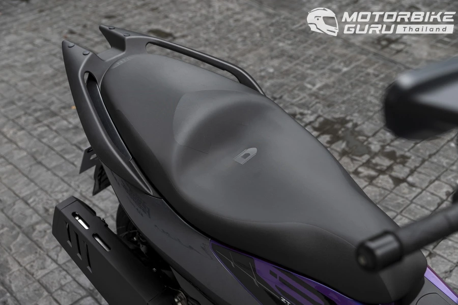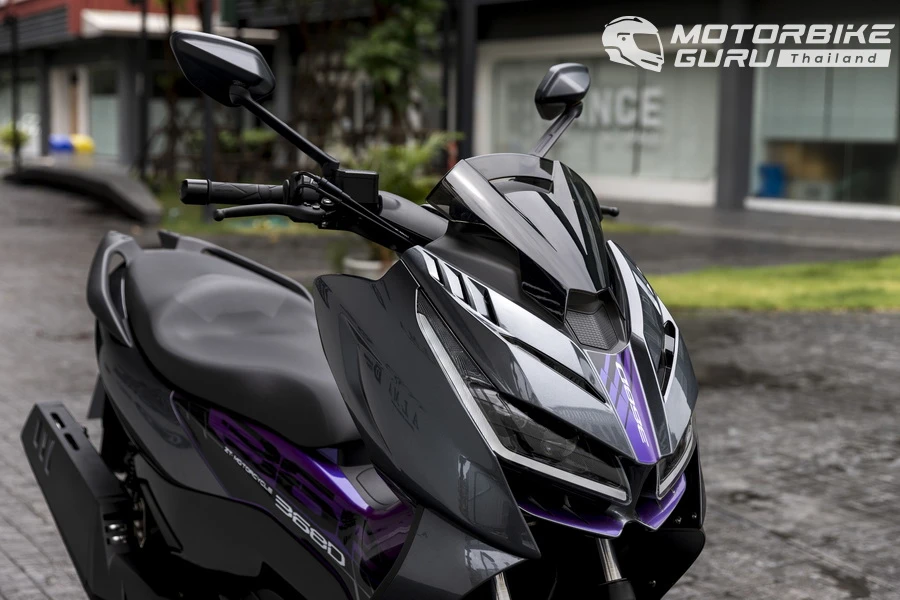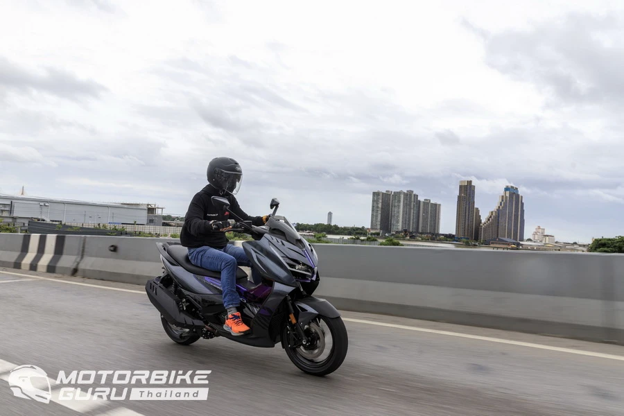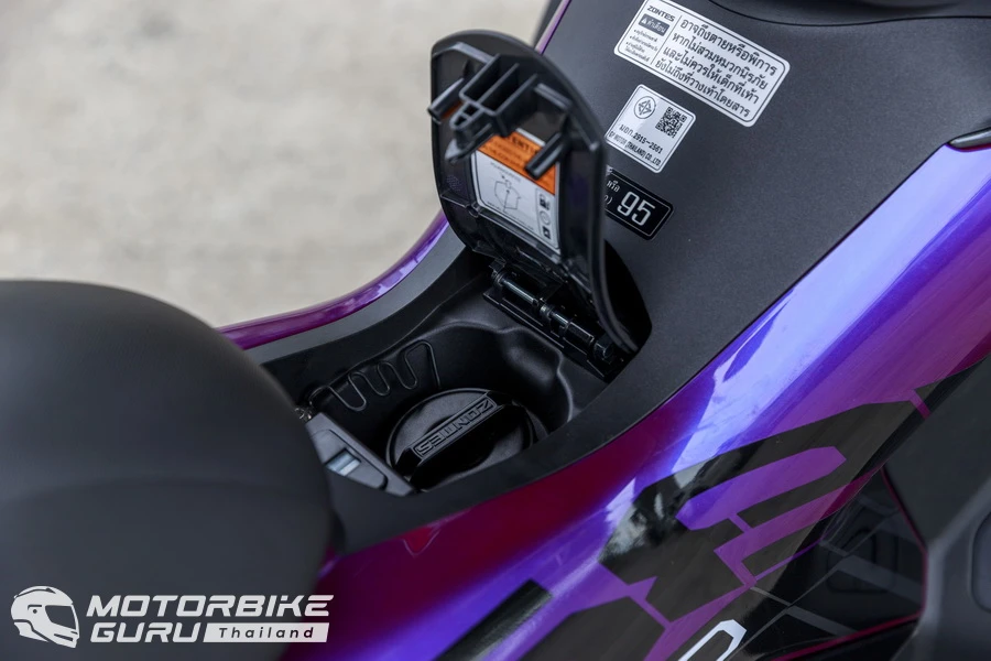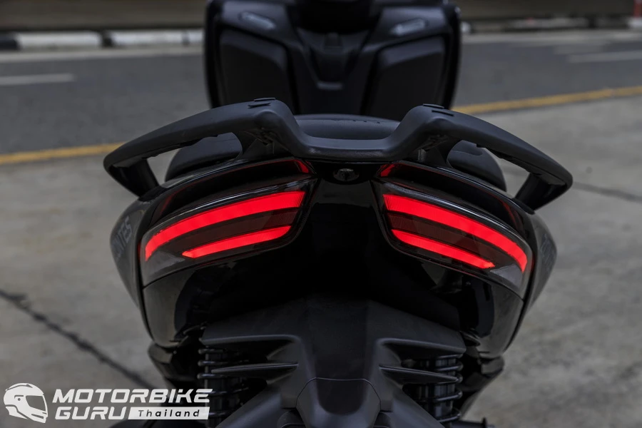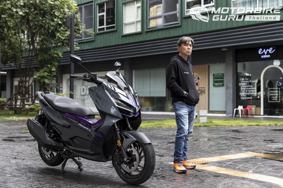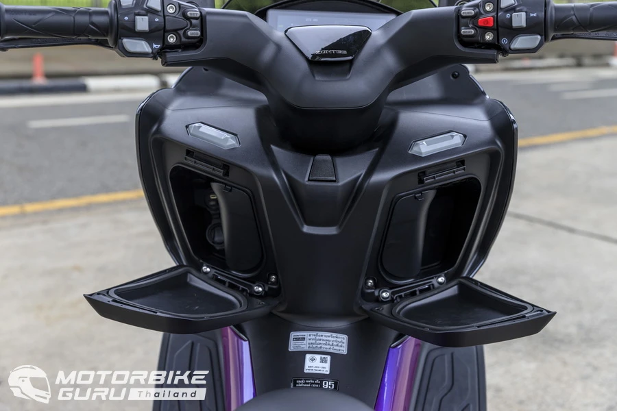 เพื่อสัมผัสถึงพลังเครื่องยนต์ขนาด 368 ซีซี รุ่นใหม่ล่าสุด ให้พละกำลังแบบ High Compression รอบต้นแรงทันใจ ความเร็วไหลไปได้เรื่อยๆ ไม่ต่ำกว่า 160 กม./ชม. ในโหมด Sport ไปได้อย่างมั่นใจในทุกความเร็ว จนมาจอดเก็บภาพอีกครั้งเพื่อบันทึกรายละเอียดต่างๆ ของตัวรถ แต่พบว่าตัวรถเข็นขยับจอดง่ายเพราะน้ำหนักรถเพียง 162 กก. (น้ำหนักรวมน้ำมันเต็มถังที่ 175 กก.) จุดเด่นเริ่มจากระบบไฟส่องสว่าง LED ทั้งคัน ความอเนกประสงค์กับพื้นที่ใต้เบาะที่ใช้งานได้สะดวก เก็บหมวกกันน็อคได้ และเก๊ะคู่หน้าที่ด้านซ้ายมี 2 ช่องจ่ายไฟทั้งแบบ USB-A และ C ด้านขวาเก็บของชิ้นเล็กหยิบได้สะดวกมือ ตรงกลางแฮนด์มีขอเกี่ยวที่พับซ่อนไว้สามารถเปิดออกมาเกี่ยวถุงได้สะดวก