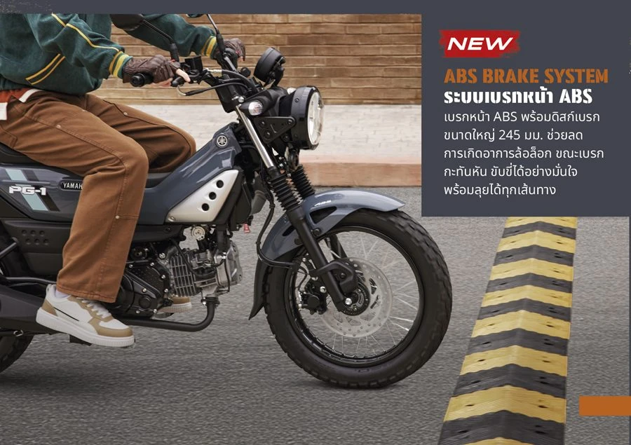 โดยได้รับการอัพเกรด เบรกหน้าใหม่! ที่มีระบบเบรก ABS พร้อมดิสก์เบรกขนาดใหญ่ 245 มม. ช่วยลดการเกิดอาการล้อล็อก ขณะเบรกกะทันหัน ขับขี่ได้อย่างมั่นใจ และ ยาง Block ลายใหม่ ดอกยางใหญ่ขึ้น หน้ายางกว้าง เกาะถนนทรงตัวดี ขี่นุ่มนวล เพิ่มสมรรถนะการขับขี่ ไม่ว่าจะทางเรียบ หรือทางลุย ก็ขี่ได้ทุกวัน มันส์ได้ทุกเส้นทาง