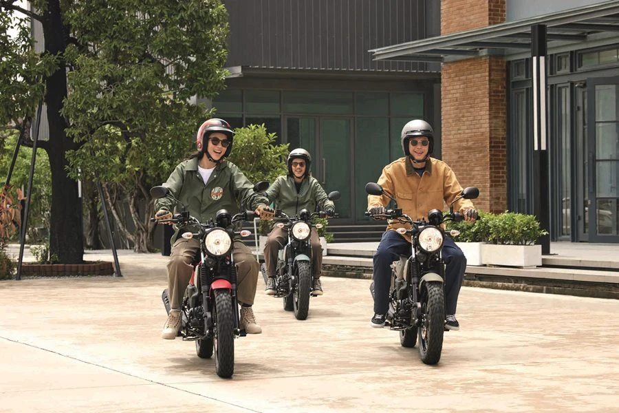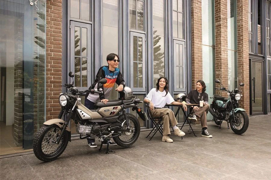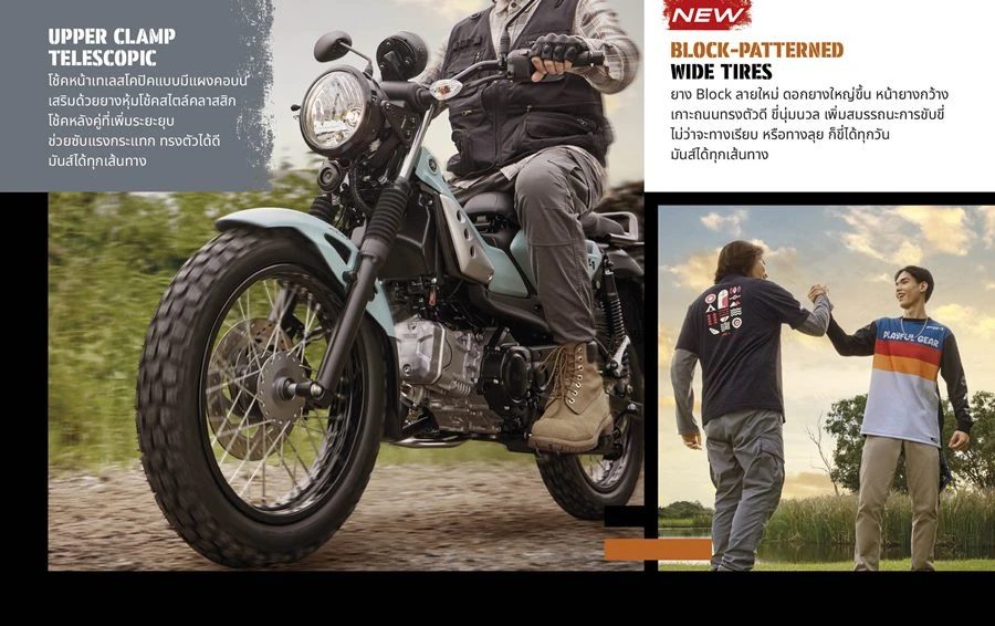 Upright Handle Bar แฮนด์บาร์กว้าง ช่วยให้ทรงตัวดี และมีความสูงเหมาะกับทุกสไตล์การขับขี่, Upper Clamp Telescopic โช้คหน้าเทเลสโคปิคแบบมีแผงคอบน เสริมด้วยยางหุ้มโช้คสไตล์คลาสสิก โช้คหลังคู่ที่เพิ่มระยะยุบ ช่วยซับแรงกระแทก ทรงตัวได้ดี มันส์ได้ทุกเส้นทาง, High Ground Clearance ระยะสูงจากพื้นถึงเครื่องยนต์ 190 มม. ขี่ลุยข้ามสิ่งกีดขวางพิชิตทุกความท้าทายได้อย่างมั่นใจในทุกวัน