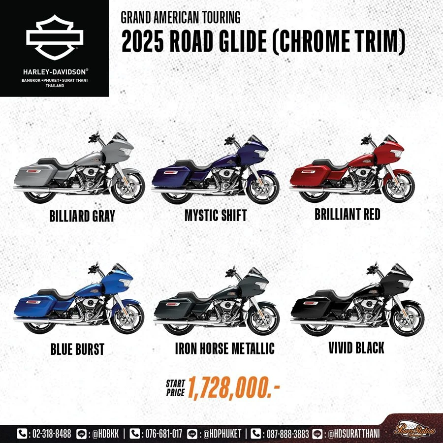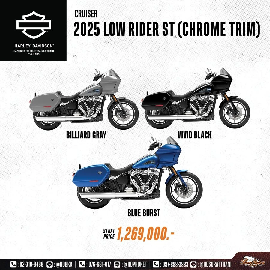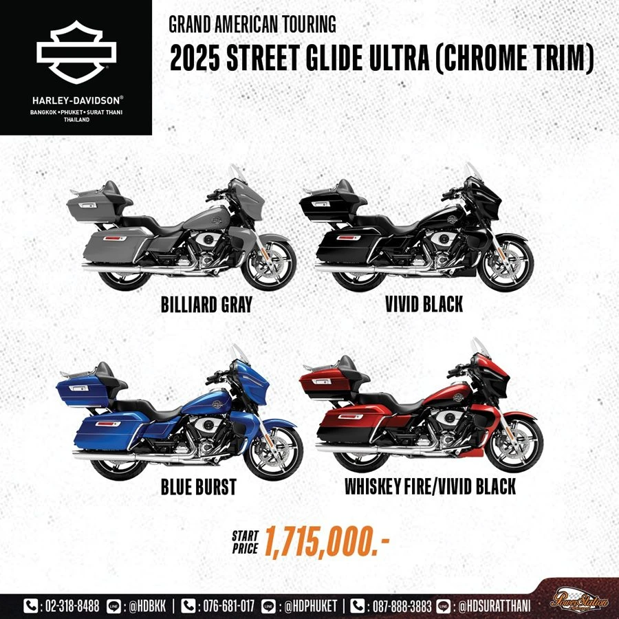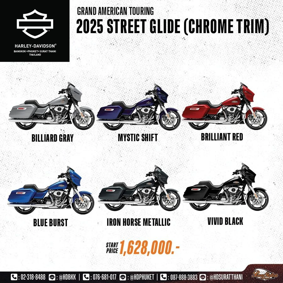 ในปีนี้ Harley-Davidson ได้เสริมทัพไลน์อัพที่ผสานกับดีไซน์สีโครเมียม ในรถมอเตอร์ไซค์ตระกูล Touring และ Cruiser 4 รุ่นใหม่ล่าสุด อย่าง Street Glide™, Road Glide™, Street Glide Ultra™, และ Low Rider™ ST ซึ่งแต่ละรุ่นล้วนโดดเด่นด้วยเอกลักษณ์เฉพาะตัว และเทคโนโลยีเหนือชั้น มาพร้อมสมรรถนะทรงพลัง และการควบคุมที่เฉียบคม ตอบโจทย์นักขับขี่ที่ต้องการพลังในการขับขี่ ความสะดวกสบาย และความโดดเด่นบนท้องถนน พร้อมยกระดับการเดินทางระยะไกลด้วยสมรรถนะขั้นสูง