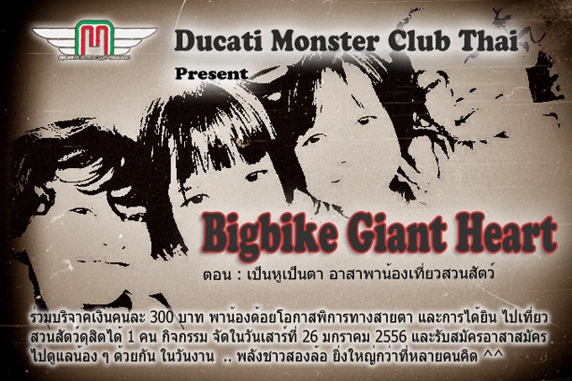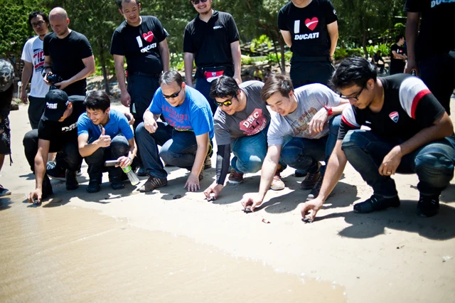 (1) โครงการ "ซับน้ำตาล้างใจ" เป็นโครงการช่วยเหลือทหาร 3 จังหวัดชายแดนภาคใต้ (2) โครงการ "Big Bike, Giant Heart" เป็นการอาสาพาเด็กที่มีความพิการทางด้านร่างกายเที่ยวสวนสัตว์เขาดิน (3) โครงการ "น้ำใจให้น้อง" ซึ่งเป็นโครงการช่วยเหลือส่งเสริมเด็กที่ยากจนหรือโรงเรียนที่ขาดแคลนในถิ่นทุรกันดาร และ (4) ศูนย์ดูคาติทองหล่อได้นำรายได้ส่วนที่เหลือจากการประมูลรถจักรยานยนต์รุ่นหายาก GT1000 Touring ไปมอบให้แก่มูลนิธิอาสาเพื่อนพึ่ง(ภาฯ)ยามยาก สภากาชาดไทย ตามพระดำริของพระเจ้าหลานเธอ พระองค์เจ้าพัชรกิติยาภา และล่าสุดได้มีการจัดกิจกรรม Back to Nature เป็นการรวมตัวของกลุ่ม Ducati Hypermotard และ Hyperstrada ออกทริปไปศูนย์อนุรักษ์พันธุ์เต่าทะเล กองทัพเรือ ฐานทัพเรือสัตหีบ จ.ชลบุรีนำ เพื่อลูกเต่าจากศูนย์อนุบาลเต่าปล่อยลงสู่ท้องทะเลกลับคืนสู่ธรรมชาติ ช่วยอนุรักษ์พันธุ์เต่า