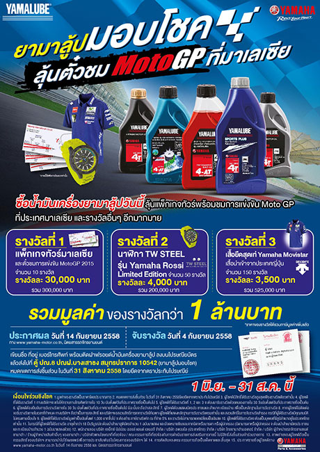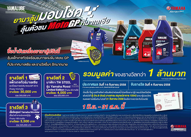 บริษัท ไทยยามาฮ่ามอเตอร์ จำกัด ผู้ผลิตและจำหน่ายรถจักรยานยนต์ยามาฮ่า เดินหน้ารุกตลาดน้ำมันเครื่องยามาลู้ปเจาะกลุ่มผู้ใช้รถจักรยานยนต์ ด้วยการจัดแคมเปญ "ยามาลู้ป มอบโชค ลุ้นตั๋วชม MotoGP ที่มาเลเซีย" โดยมีกติกาง่ายๆ เพียงเขียนชื่อ ที่อยู่ เบอร์โทรศัพท์ พร้อมติดฝาฟอยล์น้ำมันเครื่องยามาลู้ป ลงบนไปรษณียบัตร แล้วส่งมาที่ ตู้ปณ.8 ปณฝ.บางเสาธง สมุทรปราการ 10542 วงเล็บ (ยามาลู้ปมอบโชค) ได้ตั้งแต่วันที่ 1 มิถุนายน - 31 สิงหาคม 2558 เพื่อร่วมลุ้นรางวัลแพ็กเกจทัวร์พร้อมตั๋วชมการแข่งขัน MotoGP ที่ประเทศมาเลเซีย และรางวัลอื่นๆ อีกมากมาย รวมมูลค่ากว่า 1 ล้านบาท